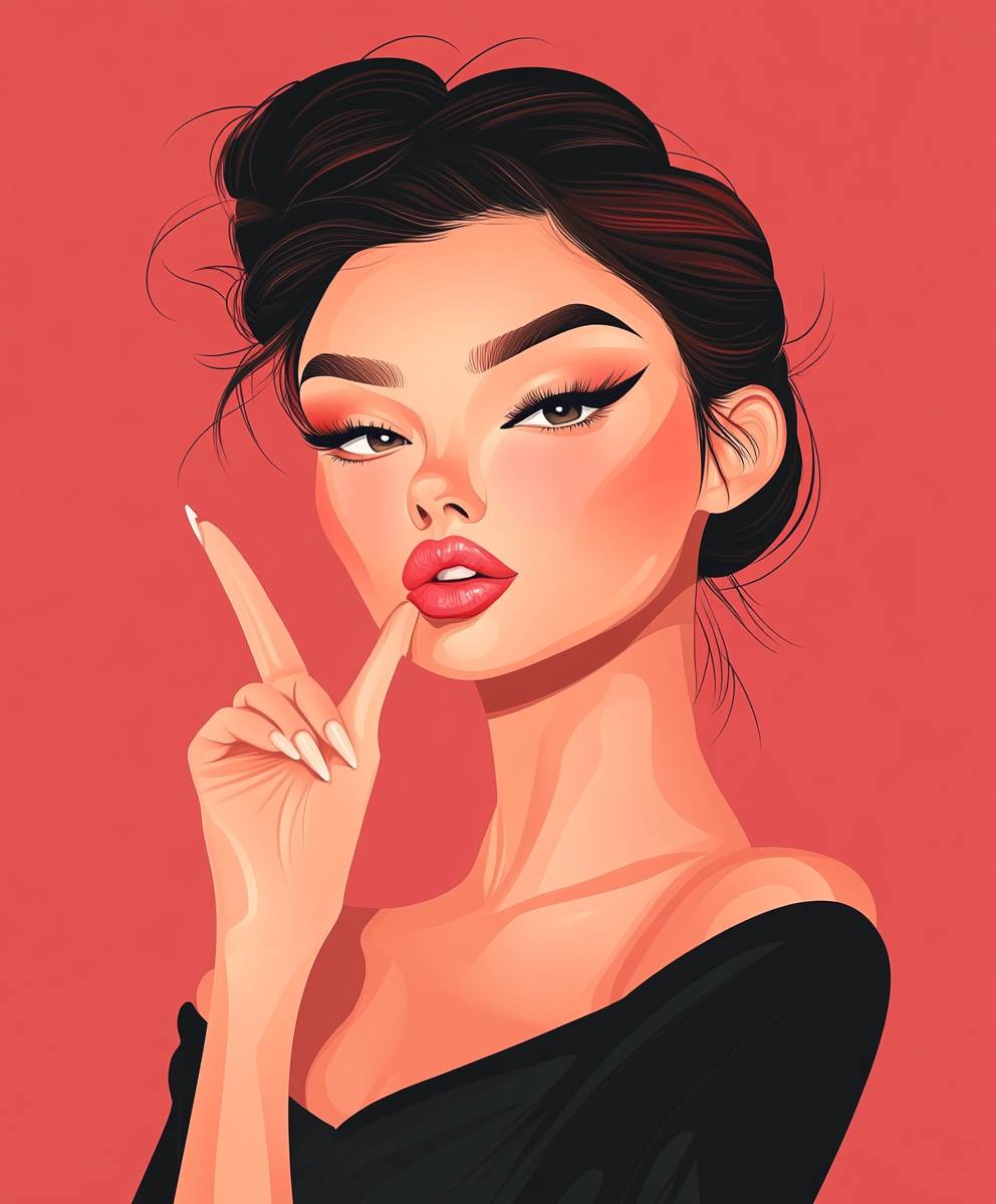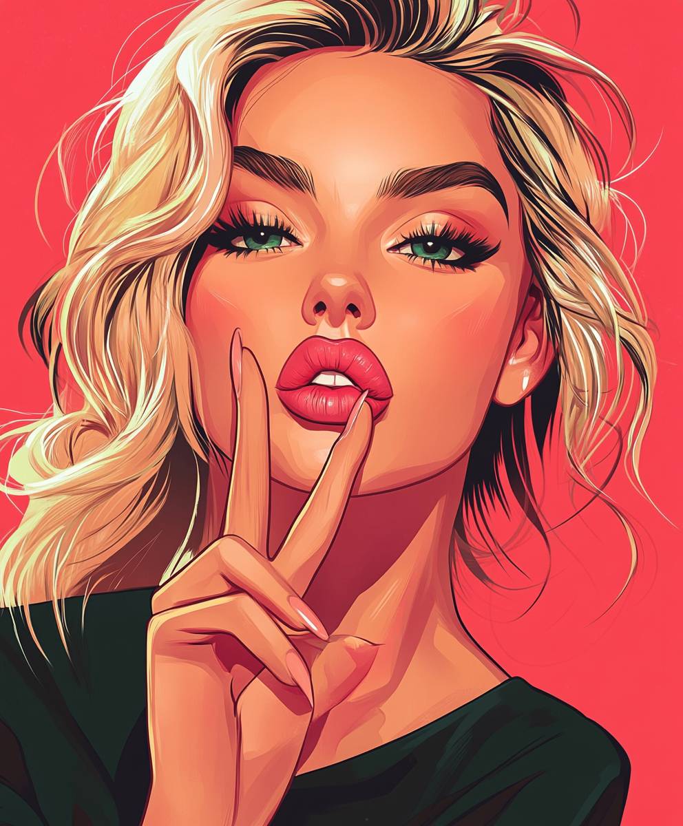 cartoon style illustration of a beautiful fashion model lady with pink and soft lips, she is looking like the statue of liberty doing the piece sign with her hand on a solid background --ar 5:6 --v 6.1