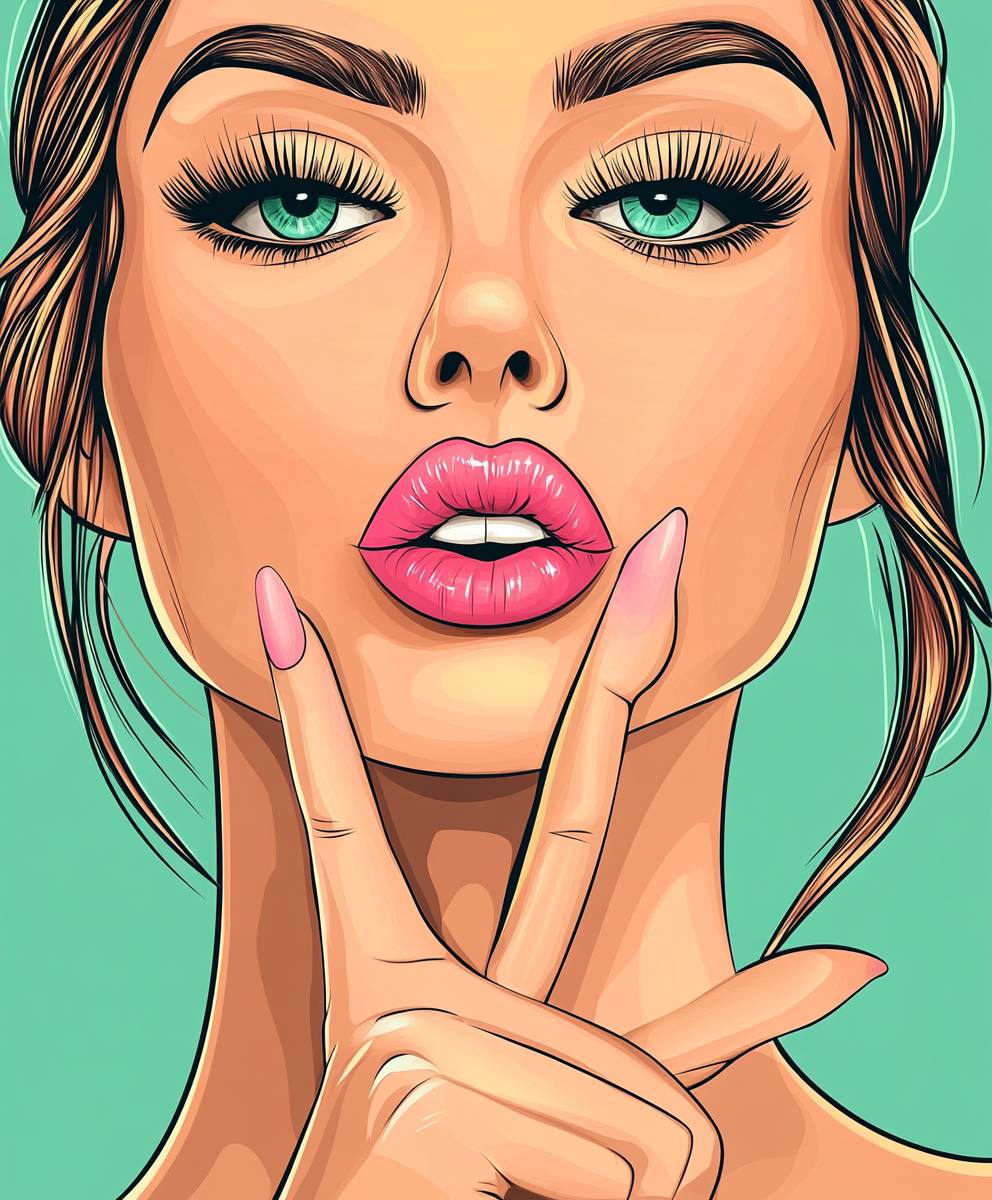 핑크색의 부드러운 입술을 가진 아름다운 패션 모델 여성의 만화 스타일 일러스트레이션으로, 그녀는 자유의 여신처럼 손으로 평화의 사인을 하고 있으며 단색 배경이 있습니다.