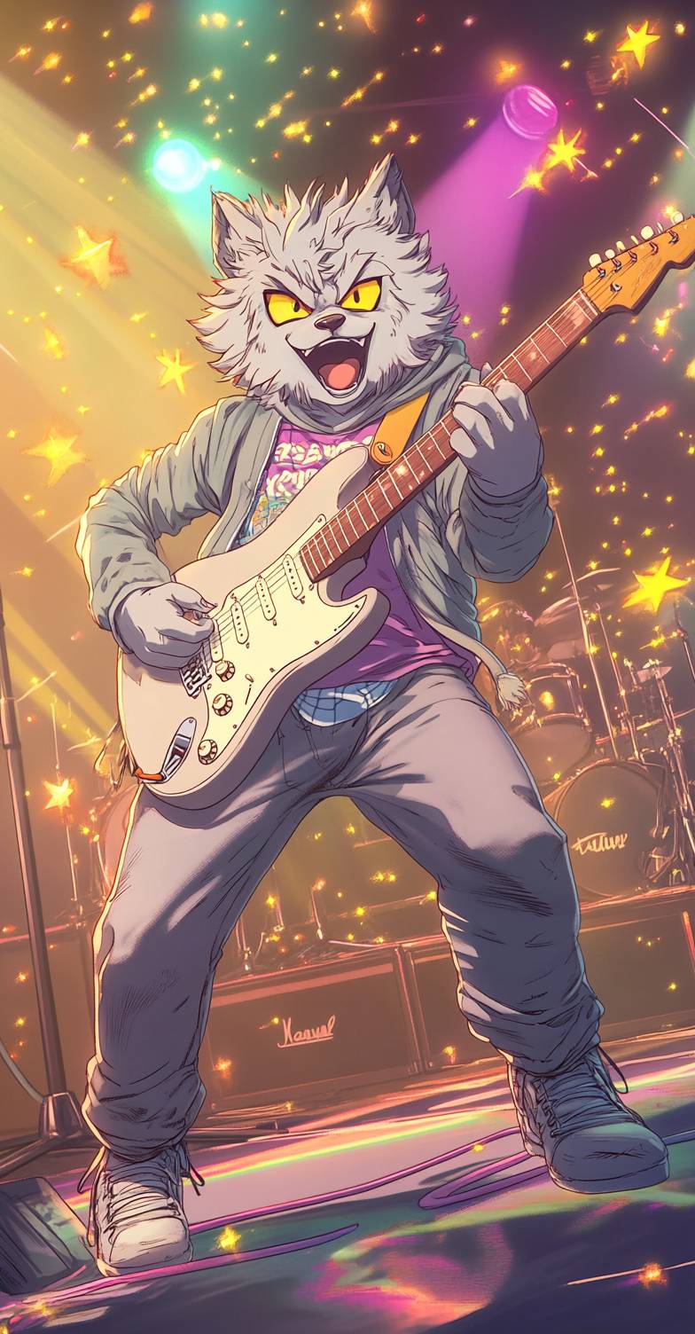 회색과 흰색 털을 가진 생물이 무대에서 신나게 일렉기타를 연주하고 있다.