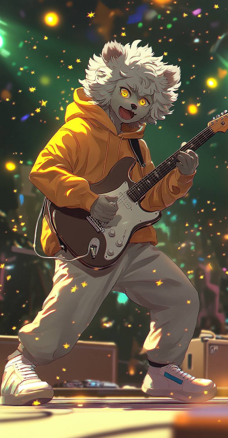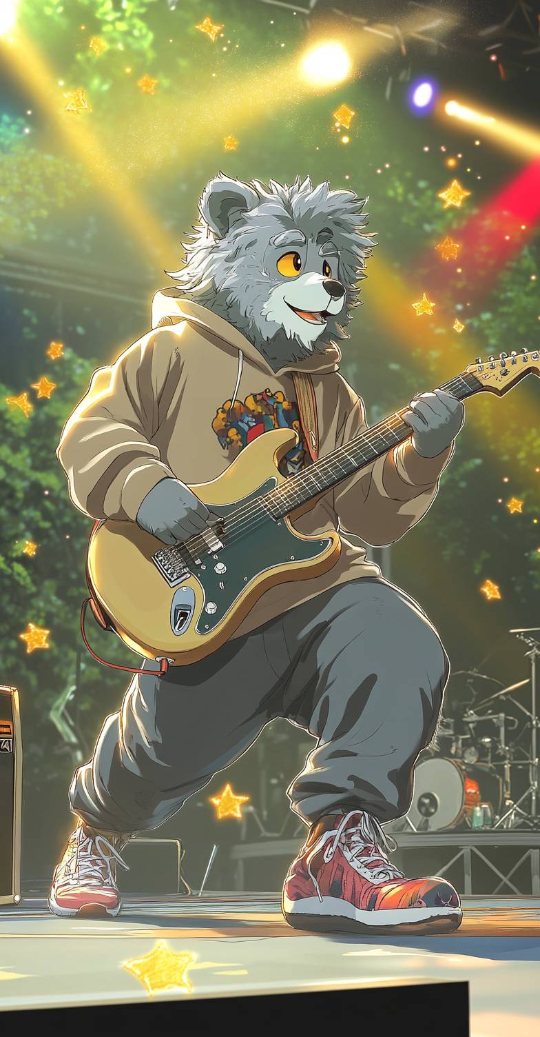 회색과 흰색 털을 가진 곰 같은 생물이 운동복 바지와 베이지색 후드티를 입고 무대에서 전기 기타를 연주하며 멋진 공연을 하고 있다. 그는 매우 흥분해 보이며, 약간 기울여서 한 발을 앞으로 내딛고 있다. 카메라는 바닥에서 그를 향해 팬닝 되고 있으며, 노란 별들이 그의 옆을 날아가며 다채로운 무대 조명의 배경에 궤적을 남기고 있다. 그의 짧고 곱슬머리는 만화 스타일이며, 두 개의 작은 노란 눈과 노란 코를 가지고 있다. 전체적인 미학은 에픽 애니메이션에서 영감을 받았다. 배경에는 푸른 나무들이 있다. 그것은 마치 에픽 애니메이션이나 만화 그림처럼 보인다. 분위기는 장엄하고 흥미진진하다.