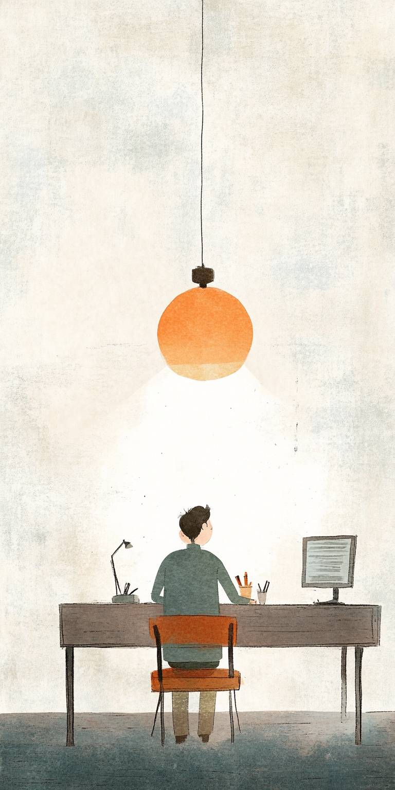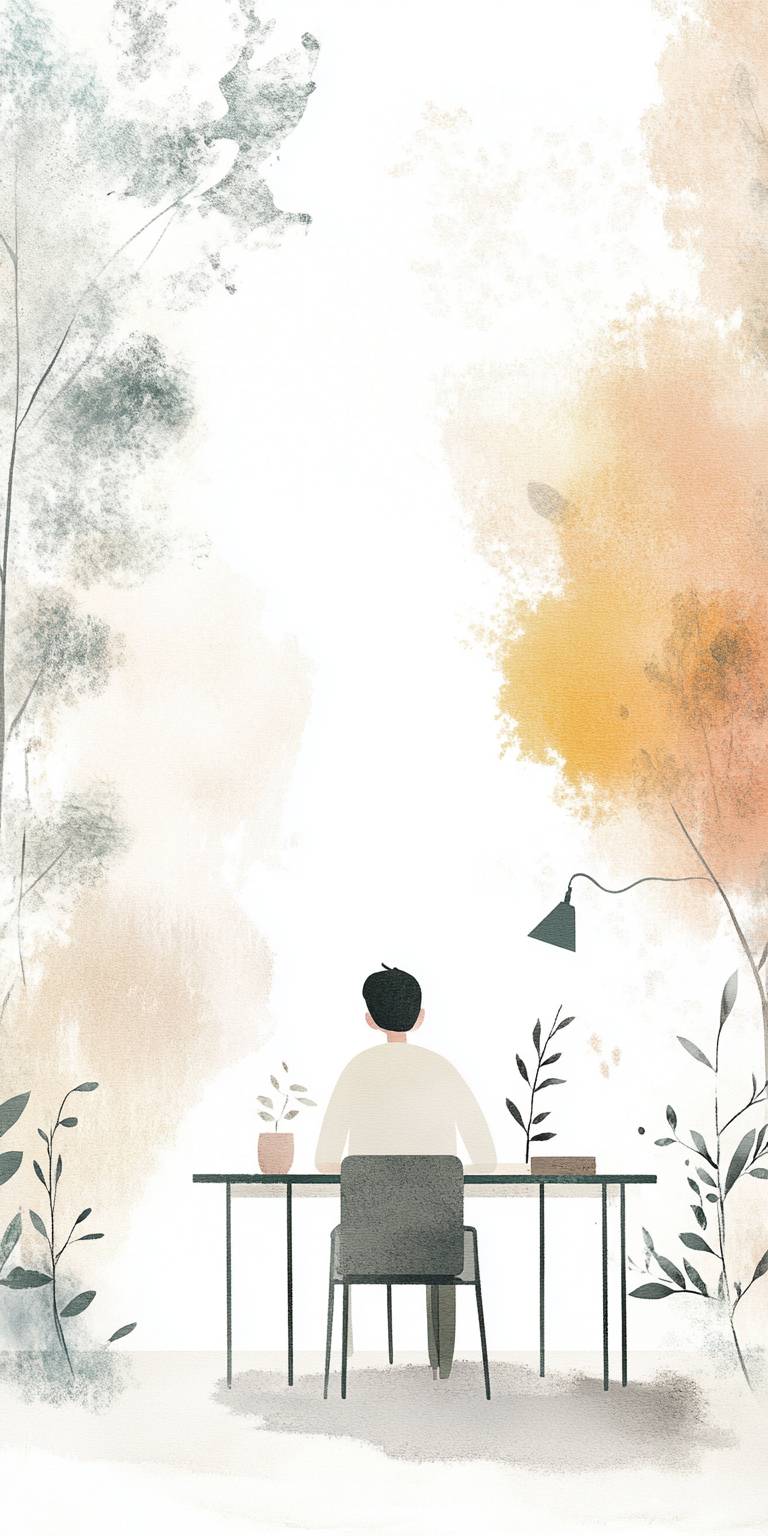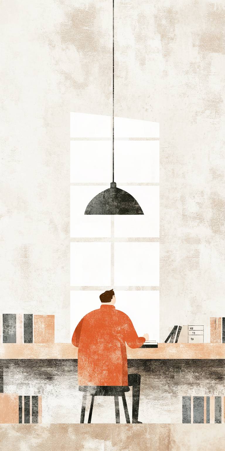 Man behind desk, simple colorful art print inspired by Jon Klassen's distinct style. Utilize a desaturated, light, and airy pastel color scheme, perfect for nursery art. The artwork should be set against a clean white background, capturing the essence of whimsical and calming children's book illustrations. Emphasize the gentle and soothing tone of the image, making it ideal for a peaceful nursery setting. --ar 1:2 --v 6.1