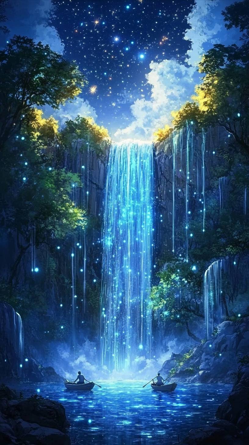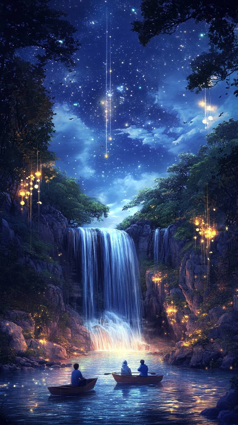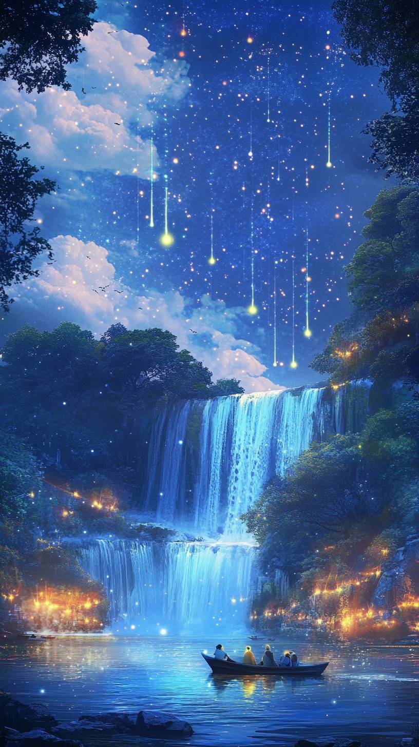 Waterfall, blue sky and white clouds, a starry night sky background, stars twinkling like fireflies in the sky, trees on both sides of the waterfall with luminous leaves hanging down from them, water flowing under the waterfall into the lake, people rowing small boats across it, a dreamy style, a fantasy world, exquisite details, a glowing light effect, high definition. --ar 9:16 --v 6.1