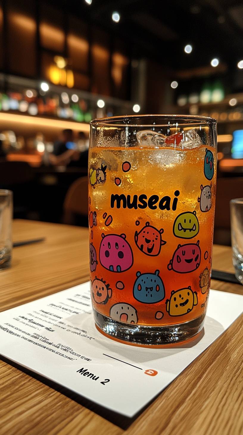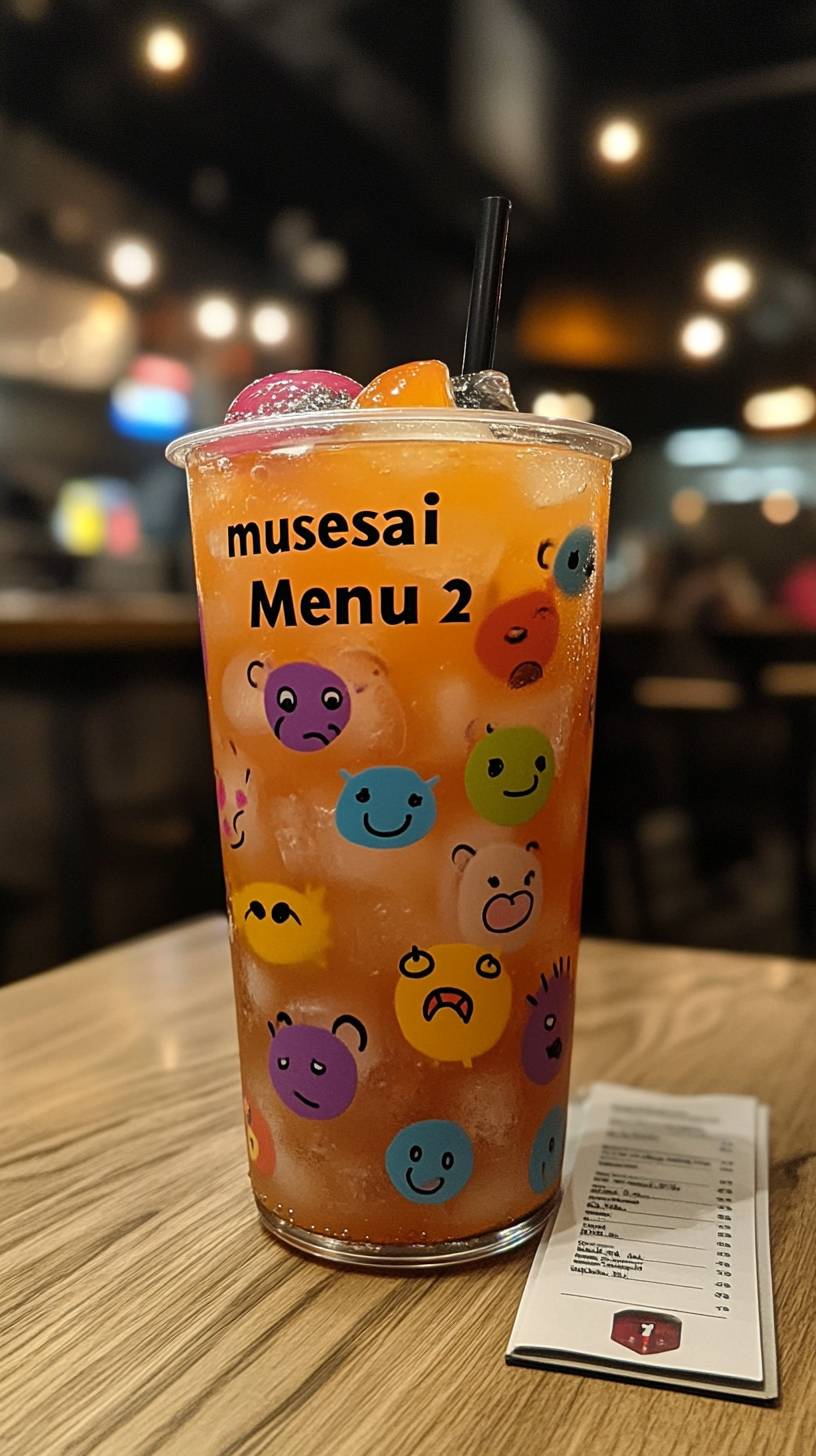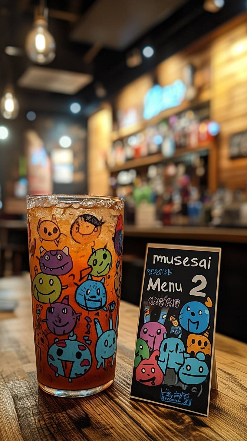 A photo of the text "musesai" written on top of an orange glass with colorful cartoon monsters drawn all over it, sitting in front of you at a bar next to its menu card that says "Menu 2". The background is a wooden floor, and there's a white tablecloth under everything. It's in the style of Super Panavision 70mm film. --ar 9:16 --stylize 750 --v 6.1