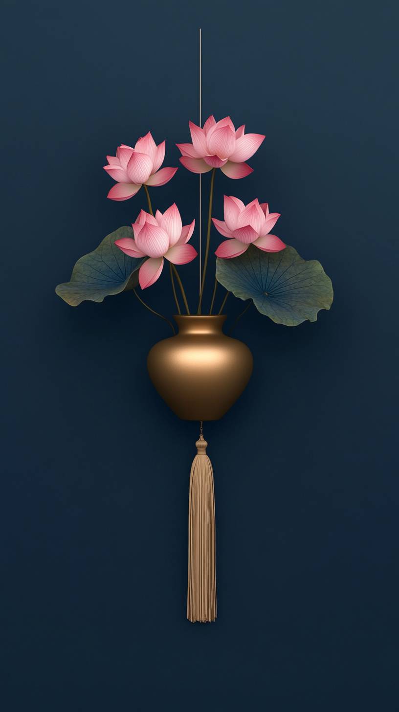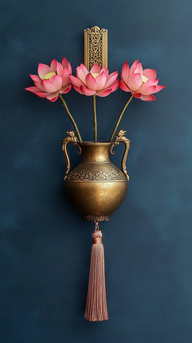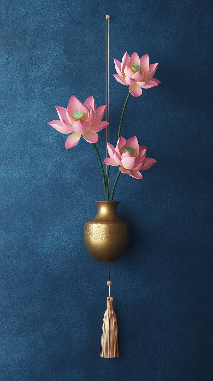 A golden vase with pink lotus flowers hanging on the wall, against a blue background, in a minimalist style, simple and elegant. The solid color of dark blue creates an atmosphere of tranquility or mystery. A tassel hangs at one end to add visual interest, in the style of a simple, elegant design --ar 9:16 --v 6.1