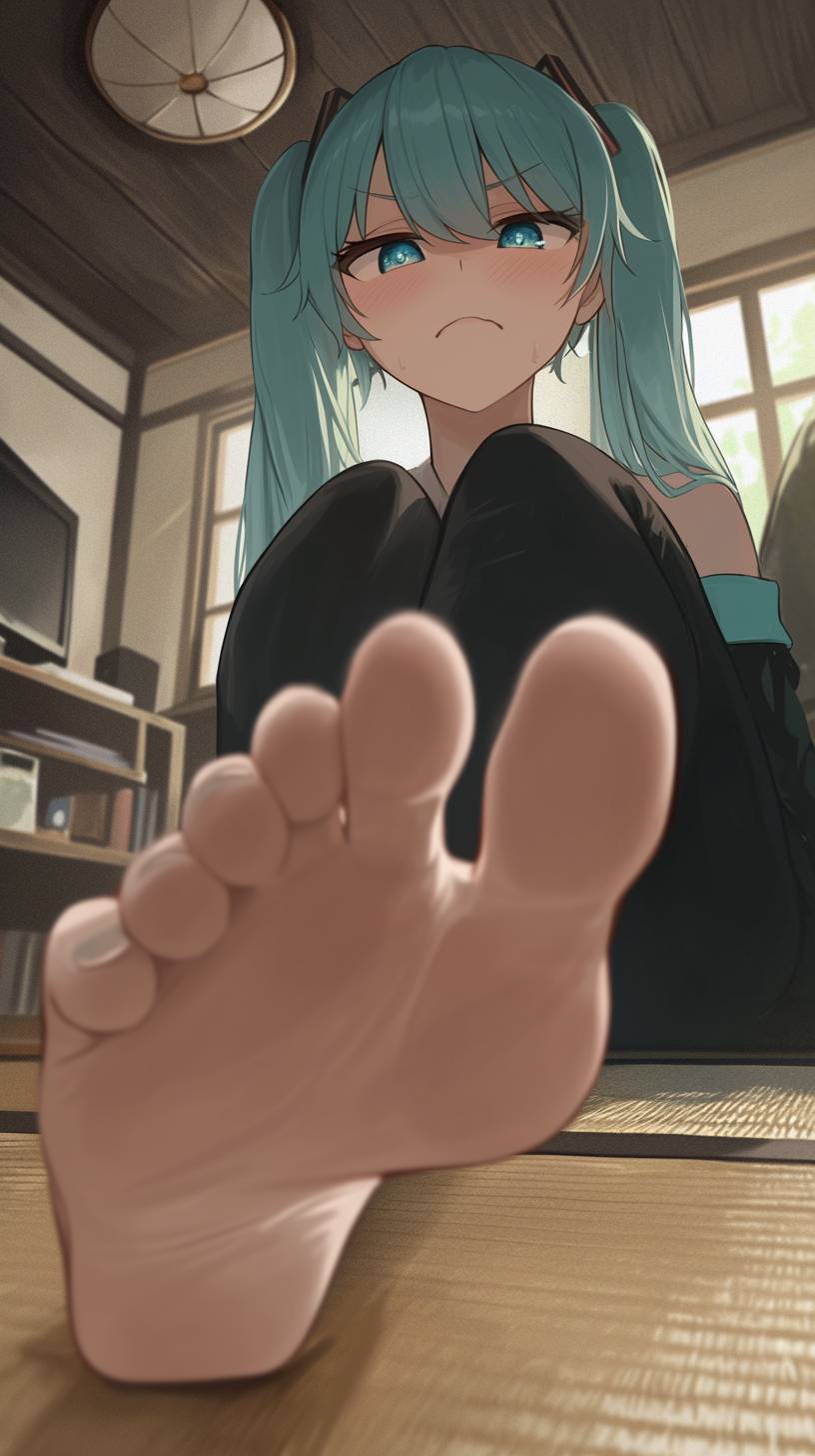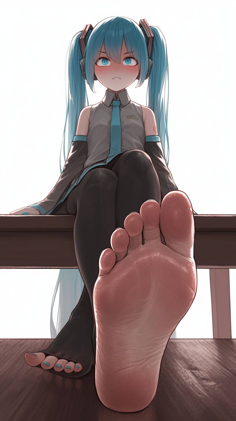 Looking at the camera with disdainful eyes ,miku,miku animation style,full_shot,Expose the sole of the foot --ar 9:16 --style raw --stylize 700 --niji 6