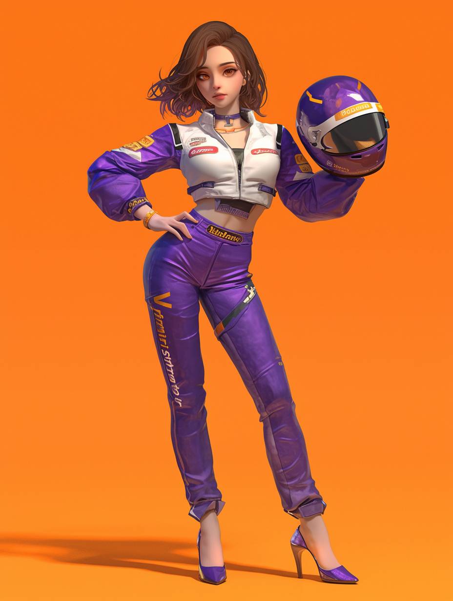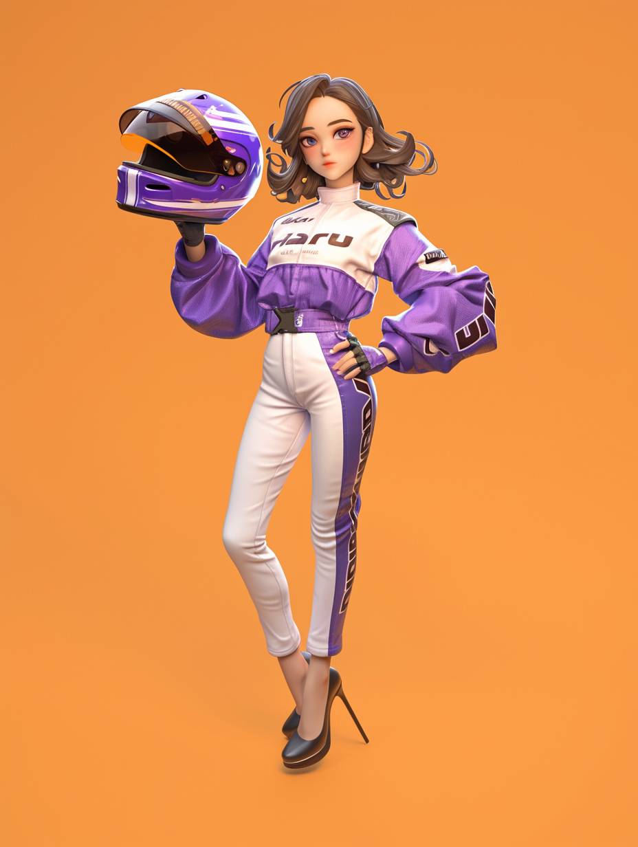 Cute anime girl wearing purple racing suit, white pants and high heels, holding helmet, full body posture, character design for mobile game "Haru Administrator", orange background, 2D art style, 3D modeling clay rendering --ar 3:4 --stylize 50 --niji 6