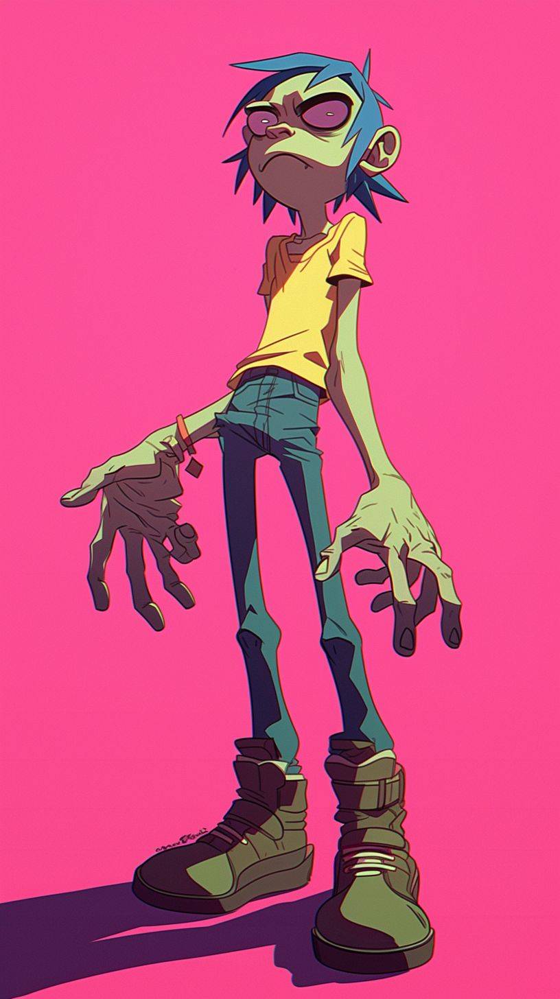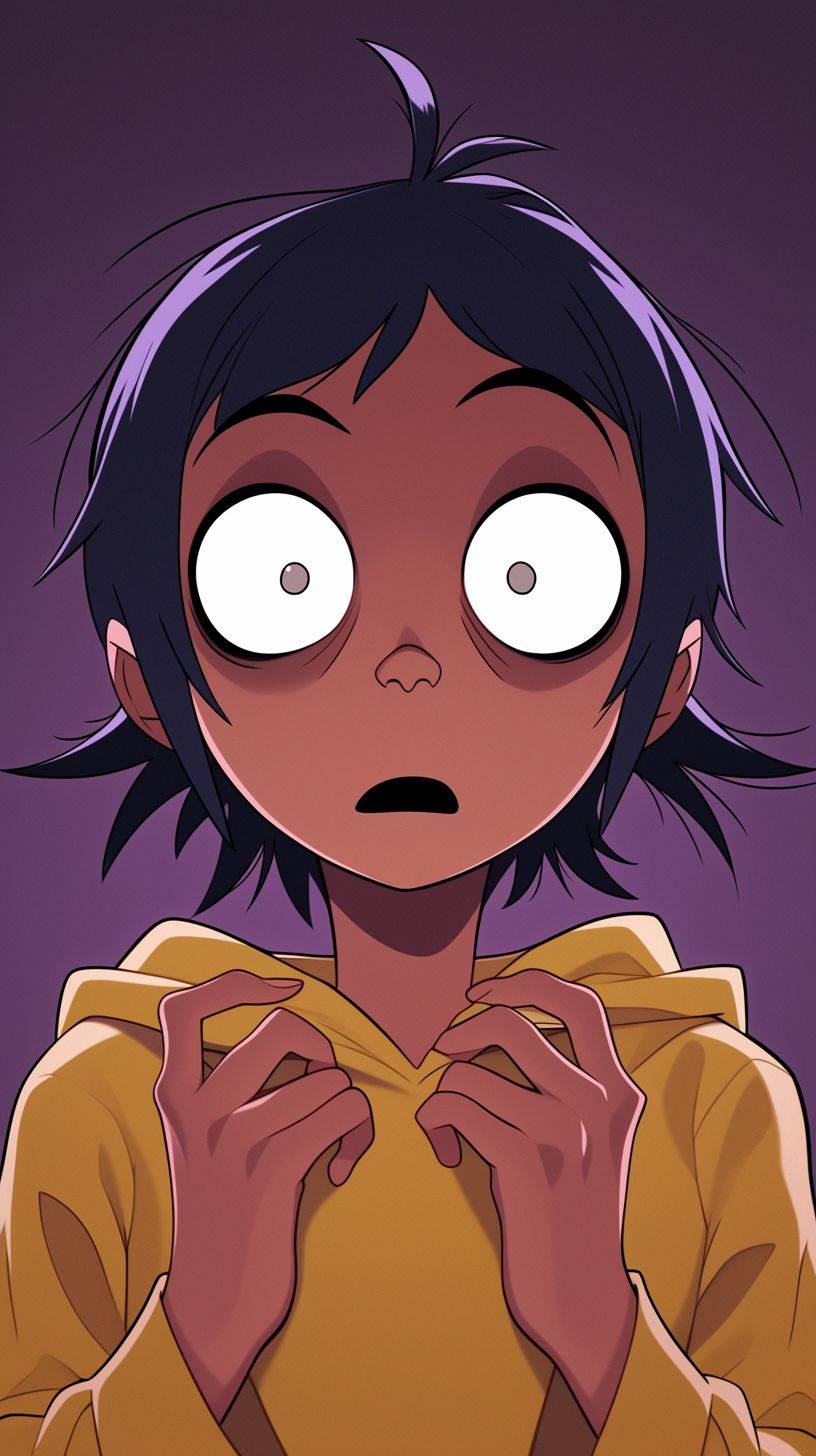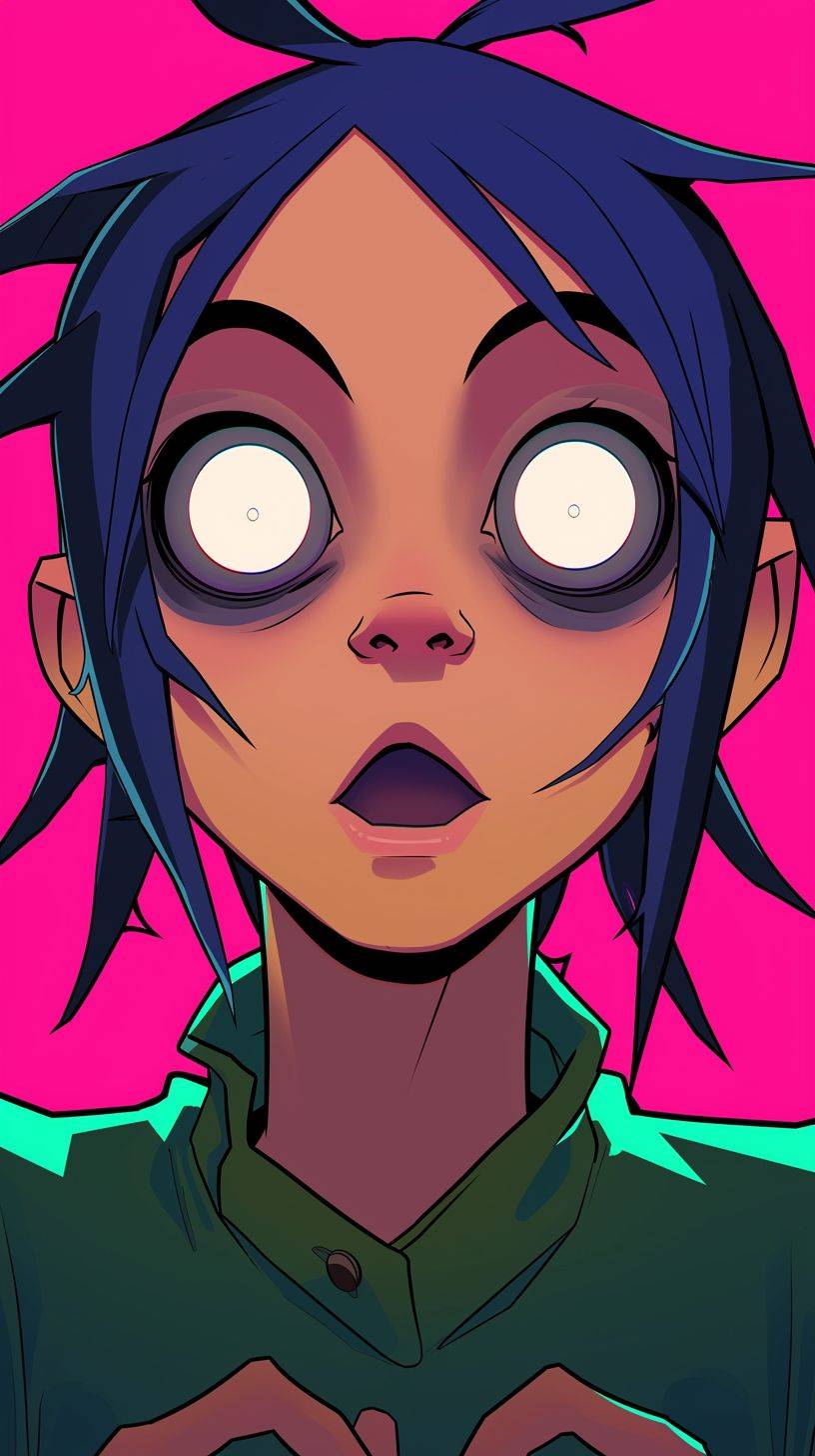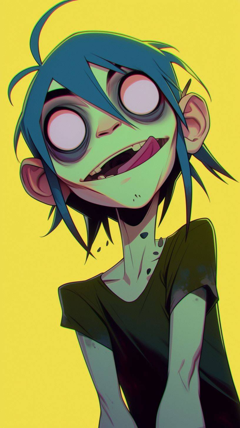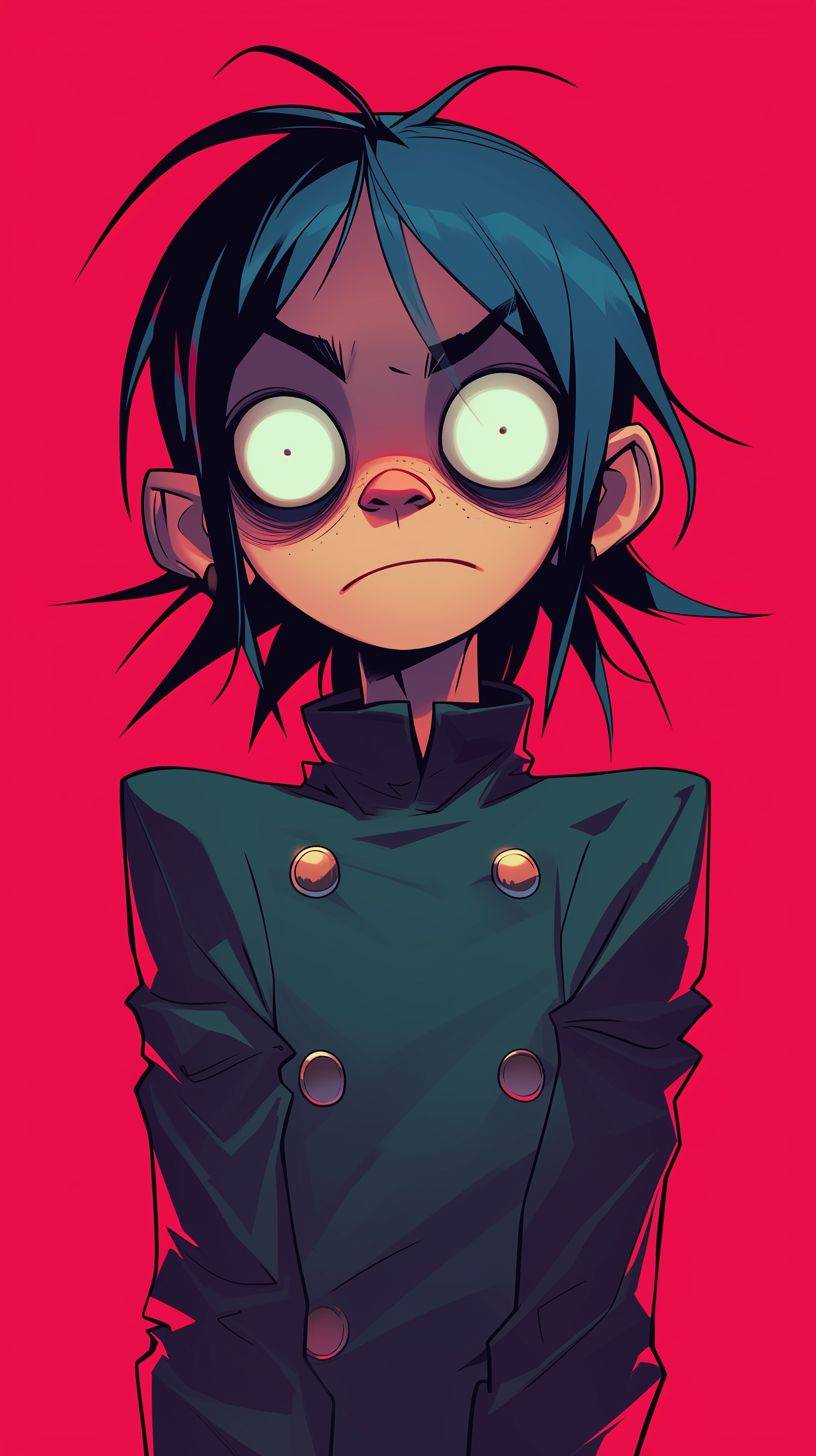 animated Gorillaz character with eyes wide open in surprise or curiosity, in the style of Akira Toriyama, retro anime style, cartoon style, high resolution, high quality, detailed skin texture, manga artstyle, best of cute, vibrant colors, 2D, full body shot --ar 9:16 --niji 6 --style raw
