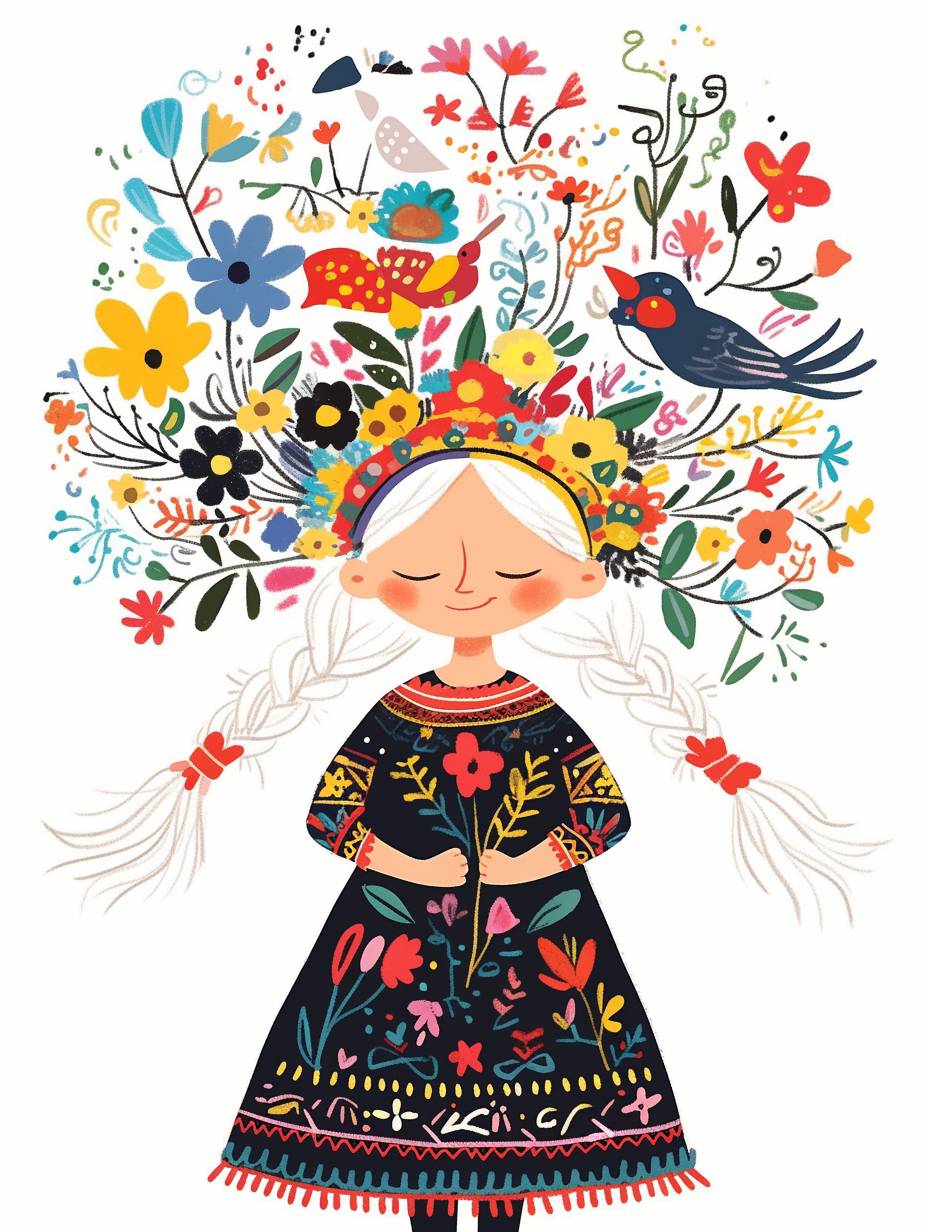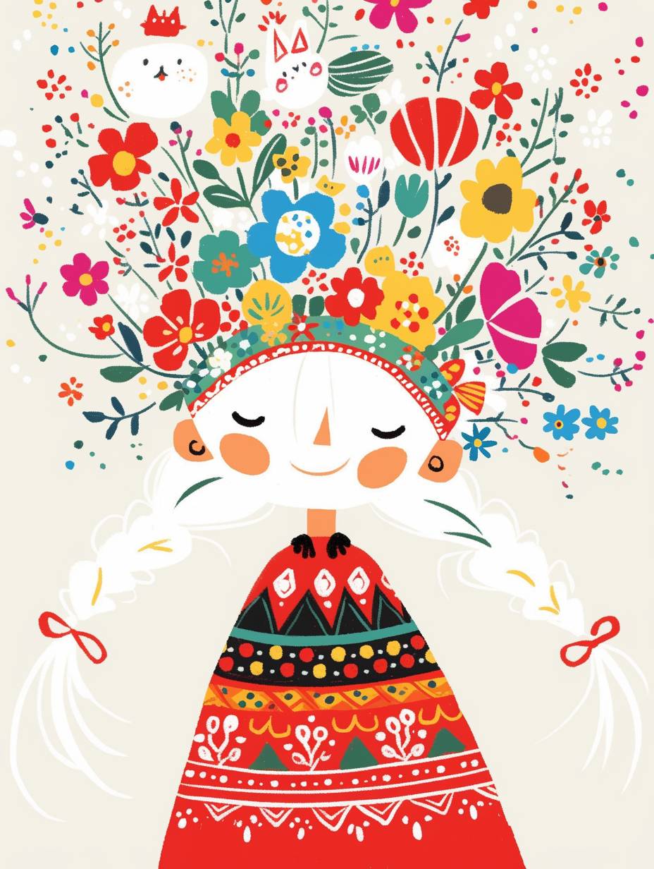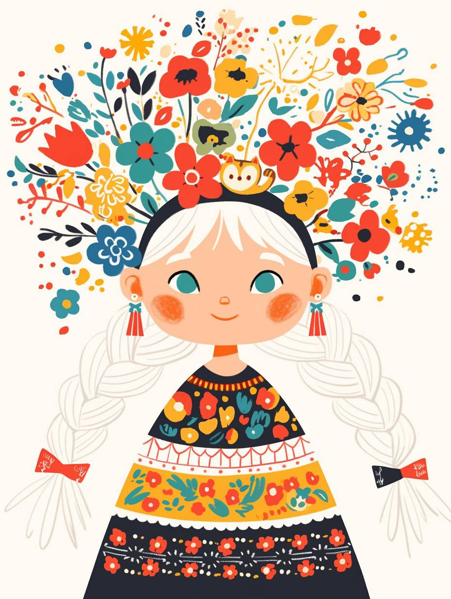 자수꽃무늬 드레스를 입은 귀여운 작은 소녀가 있습니다. 흰색 머리는 땋아서 이마에 머리띠를 쓰고 있으며, 화려한 꽃과 떠 있는 만화 고양이로 장식된 모자를 쓰고 있습니다. 그림 스타일은 단순한 선과 흰색 배경, 플랫 컬러 일러스트로 채워진 전신 초상화 스타일은 Nicoletta Kgyutai의 만화 캐릭터 디자인과 유사합니다. 그녀는 행복하게 미소 짓고 있습니다.