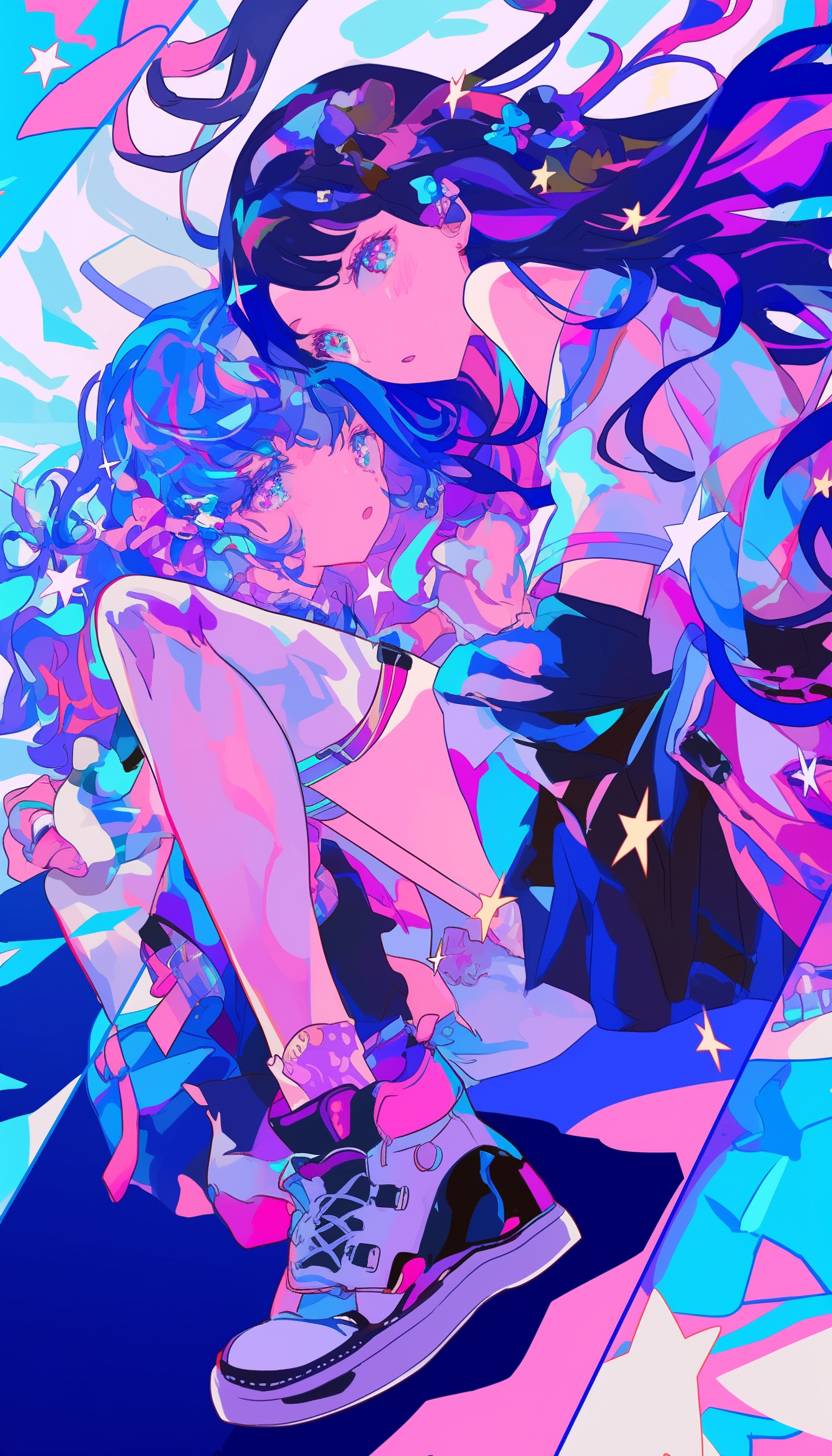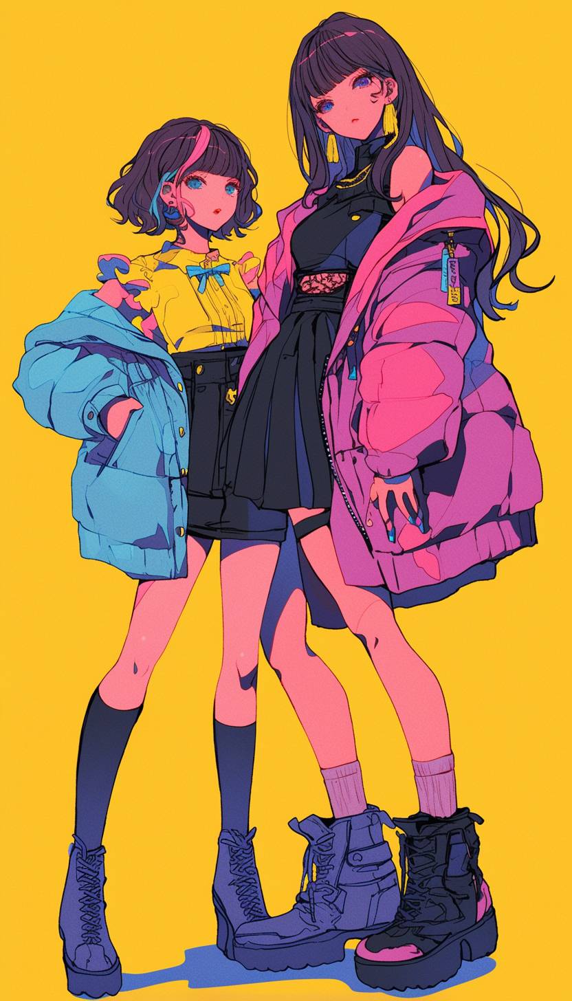 두 명의 아름답고 멋진 소녀들, 가상 아이돌 스타일, 마이 요네야마 스타일, 풍부한 디테일, 다채로운 눈, 전신 초상화, 광각 렌즈, 그림의 긴장감.