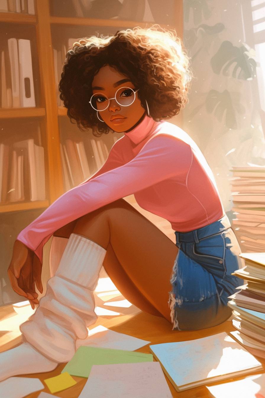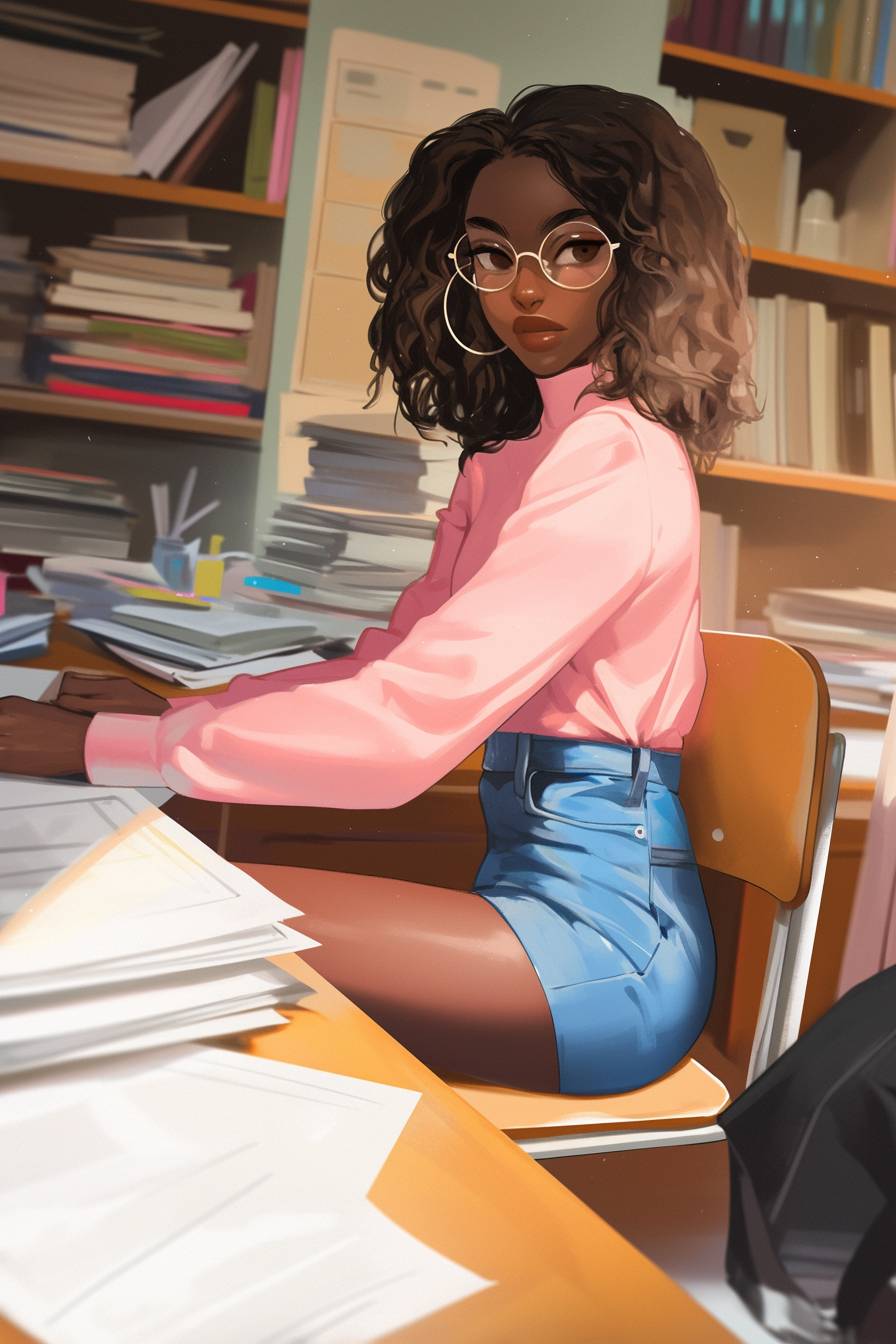 an attractive black adult female with short noir black slick flick bob, chestnut brown colored skin, Y2k inspired pastel pink long sleeve top, blue denim skirt that reaches to thighs, wearing slick pink glasses, long white socks that reach her knees, background is in a beautifully unqiue lit office during the day, the figure is sitting in her wooden desk as she is organizing papers, facing camera, looking at the viewer, glaring expression, urban, concept art, watercolor like style, soft lines (anime art style), light, eye lower level angle photo, cinematic blue lighting, --ar 2:3 --niji 6