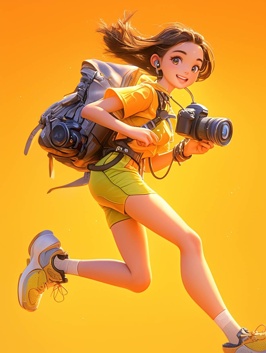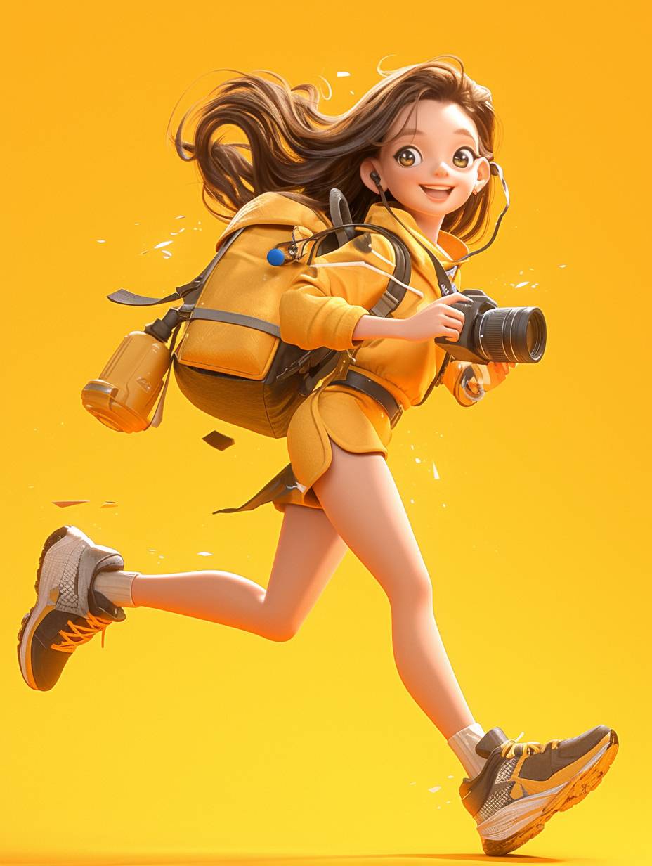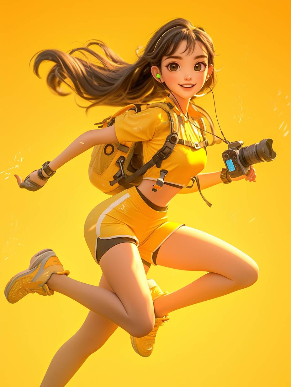 An Asian girl with brown hair, wearing yellow sportswear and carrying cameras on her back is running forward . The background color of the picture should be a bright orange. She has long legs, big eyes, a smiling facial expression, a full-body portrait, a full shot, 3D rendering, and high-definition details. --ar 3:4 --stylize 180 --niji 6