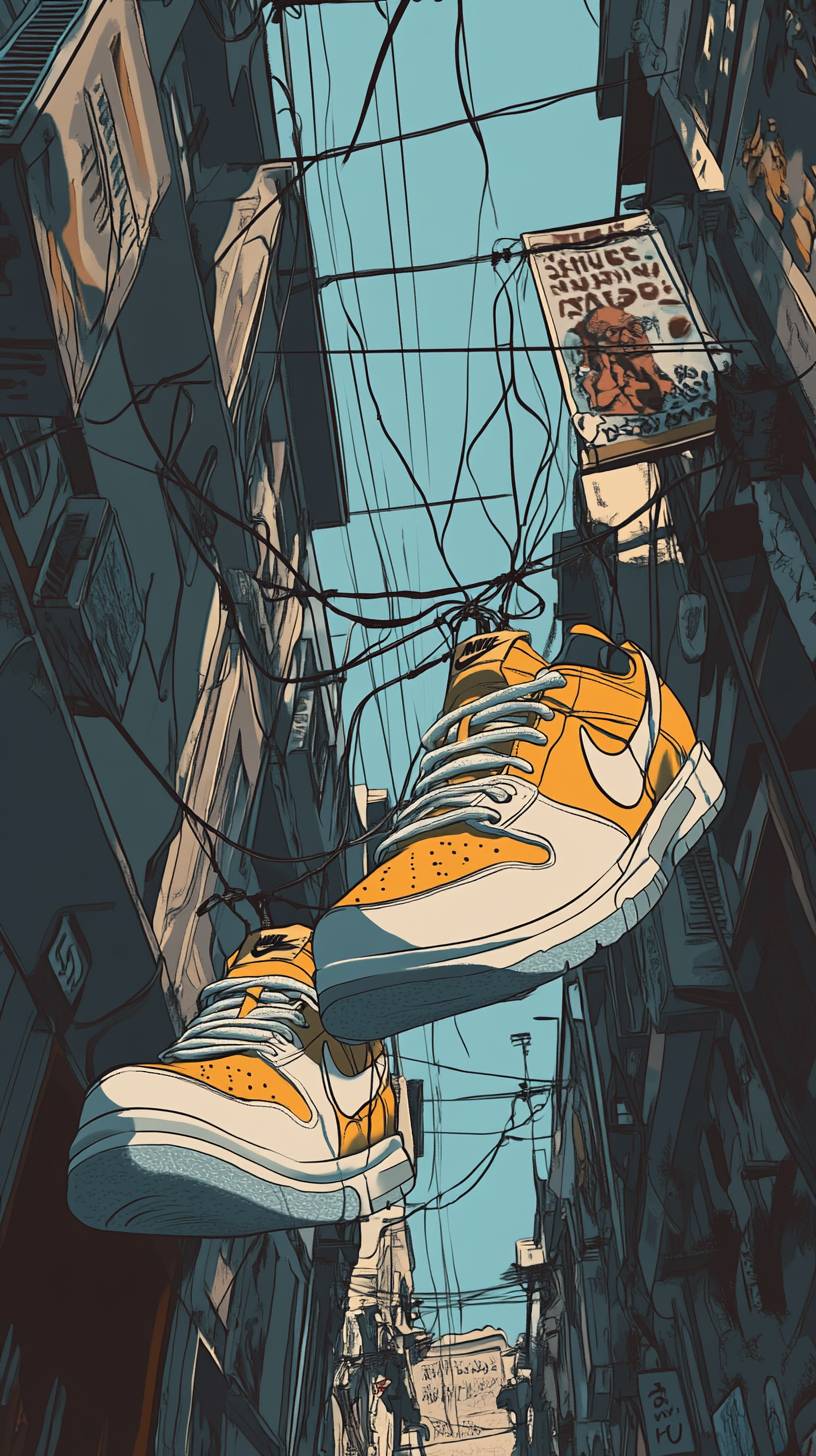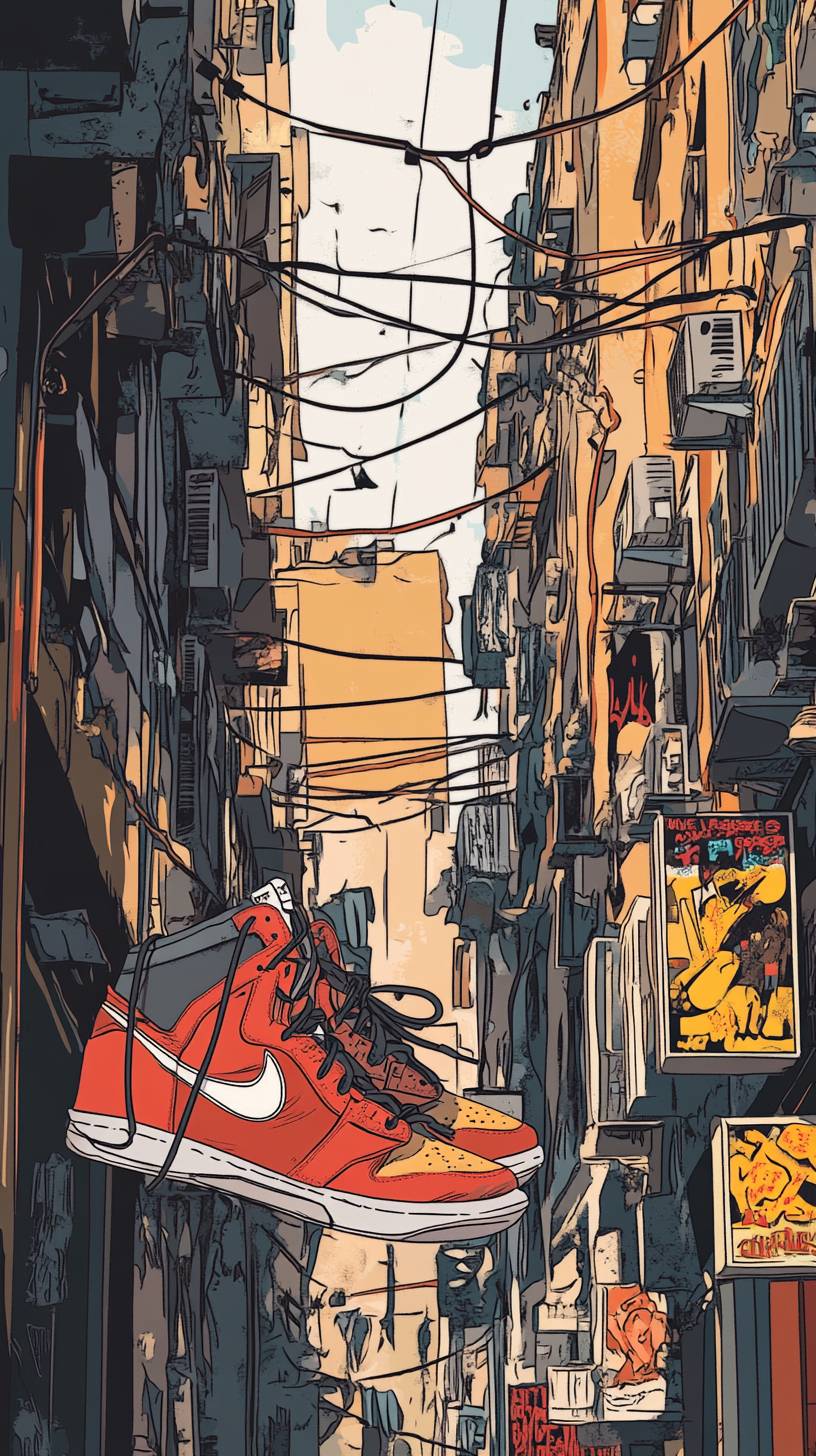 Illustration Zoom In on Nike shoes tied to electrical wires from the laces and down Slams Street in Tel Aviv with posters hanging on the walls --ar 9:16 --v 6.1