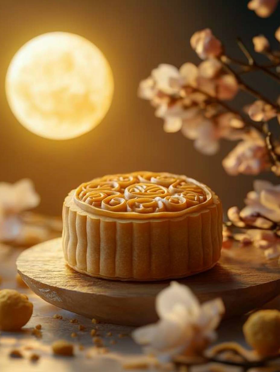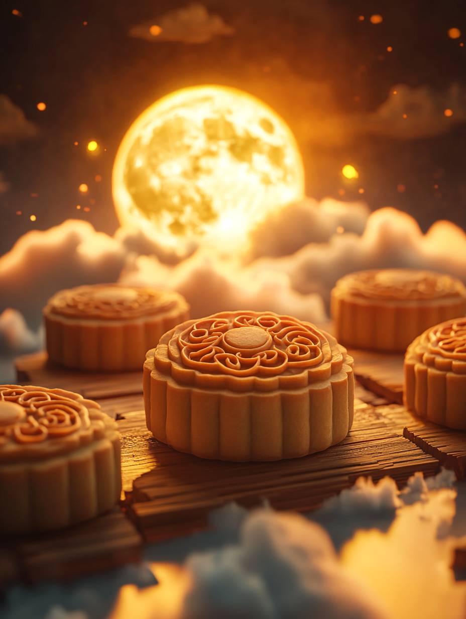 미니어처 세계, 비스듬한 사진, 매크로(사진), 중앙에 월병, 월병 뒤에 있는 달, 하늘에 있는, 가족, 사진 기울기 구성, 단순한 단색 배경, 흰색과 연한 노란색 스타일, 랜턴, 불꽃, HD 세부 사항, 점토, 만화, 카메라, 등각 뷰, 고화질, OC 렌더링, 블렌더, 8K
