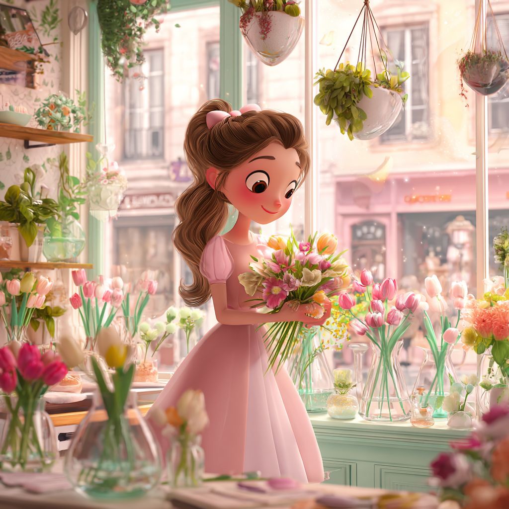 사랑스러운 치비 스타일의 소녀가 밝고 아늑한 꽃집에서 신선한 꽃을 배열하고 있습니다. 큰 반짝이는 눈, 홍조를 띤 뺨, 부드러운 미소, 리본이 달린 긴 물결 모양의 포니테일, 퍼프 소매가 있는 파스텔 핑크 드레스를 입고 있습니다. 화분에 담긴 다채로운 꽃들(튤립, 장미, 모란)로 둘러싸인, 수채화 질감으로 가득한 방이 밝은 햇빛으로 가득 차 있고, 큰 창문으로 매력적인 유럽 거리의 모습이 보입니다. 늘어져 있는 식물, 꽃이 가득한 선반, 부드러운 파스텔 색조, 기발한 낙서 스타일의 선 아트, 따뜻하고 꿈 같은 분위기, 정교하면서도 장난기 있는 일러스트, 동화 같은 미학: 기발한 수제 스톱 모션 3D 스타일, 깔끔하고 부드러운 선, 픽사와 라이카를 혼합한 모습.