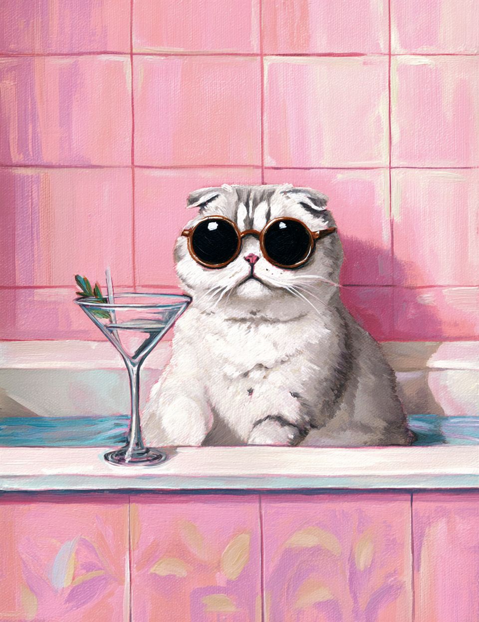 엄청 귀여운 스코티시 폴드 고양이가 선글라스를 쓰고 욕조에 앉아 있고, 옆에 마티니 잔이 놓인 유화입니다. 욕실은 핑크색 타일 벽지로 꾸며져 있습니다. 현대 미술 초상화 스타일로.