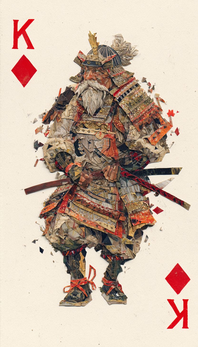 이 아트워크는 다이아몬드의 왕을 눈에 띄는 예술적 재구성으로 표현한 작품으로, 카드의 상단과 하단에 동일하게 'K' 등급이 표시되어 일관된 얼굴 정체성을 유지합니다. 위엄 있는 노인 사무라이의 모습은 카드의 틀 안에서 생생한 입체감으로 조각되었습니다. 정교한 종이 콜라주 기술을 통해 실현되었으며, 층층이 쌓인 정확하게 자른 종이를 사용하여 유체적인 깊이를 만들고 전사 형상이 카드의 경계 내에서 선명하게 돋보이도록 합니다. 흩어진 카드 조각(하트와 다이아몬드 포함)이 사무라이의 갑옷, 머리카락 및 수염에 기발하게 엮여져 고전적인 카드 모티프와 전사 이미지를 매끄럽게 결합합니다. 전통 일본 사무라이 갑옷과 날카로운 긴 칼이 작품을 더욱 풍부하게 하여, 겹겹이 쌓인 콜라주 기술이 전사 장비의 강함과 종이의 섬세한 가벼움을 균형 있게 유지하면서 형상의 3차원적 매력과 카드의 통일된 등급 표시를 정의된 범위 내에서 보존하고 있습니다.