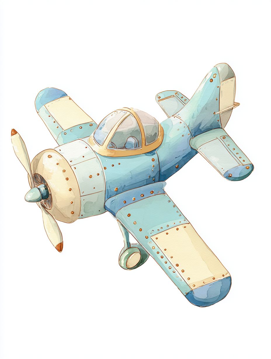 부드러운 수채화 스타일로 그려진 빈티지 프로펠러 비행기의 기발한 만화 일러스트입니다. 항공기는 연한 파란색과 크림색으로 칠해져 있으며, 날개와 동체에 장식용 리벳이 있습니다. 비행기의 코는 둥글고, 단일 프로펠러와 회전하는 프로펠러 블레이드가 있으며, 곡선형 윈드스크린이 있는 조종석이 있습니다. 날개는 약간의 각도로 배치되어 있으며, 꼬리 부분은 크림색 패널이 있는 독특한 디자인을 가지고 있습니다. 일러스트는 깨끗한 선과 부드러운 어린이 방 같은 미학을 가지고 있습니다. 비행기는 순백색 배경에 측면 프로필로 표시됩니다. 전체 구성은 부드럽고 복고풍의 느낌을 주며, 가장자리는 부드럽고 색상은 부드럽습니다.