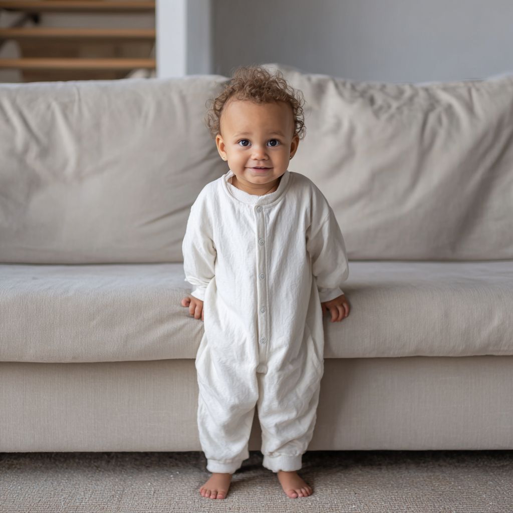 귀여운 아기 소녀가 파자마를 입고 소파 앞에 서 있습니다. 그녀는 흰색 면 잠옷을 입고 있으며, 손은 자연스럽게 옆으로 늘어져 있고, 미소를 짓고 있습니다. 전체 사진은 거실 배경에서 촬영되었으며, 연한 회색 카펫 바닥과 자연 채광이 부드러운 톤을 만들어냅니다. 사진은 소파 뒤에서 고해상도로 촬영되었습니다.