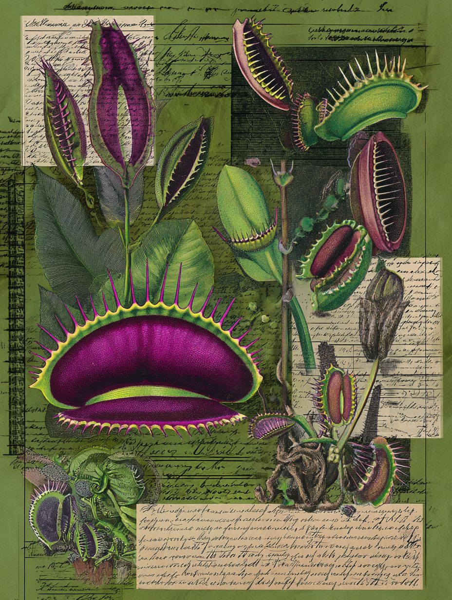 다양한 식충식물의 포획기와 이빨 형태를 보여주는 가짜 층 구조의 삽화 페이지, 콜라주 레이아웃, 손으로 쓴 표本 라벨, 풍부한 녹색 및 보라색 톤, 식물 공포 미학, 전체 인쇄 가능한 페이지.