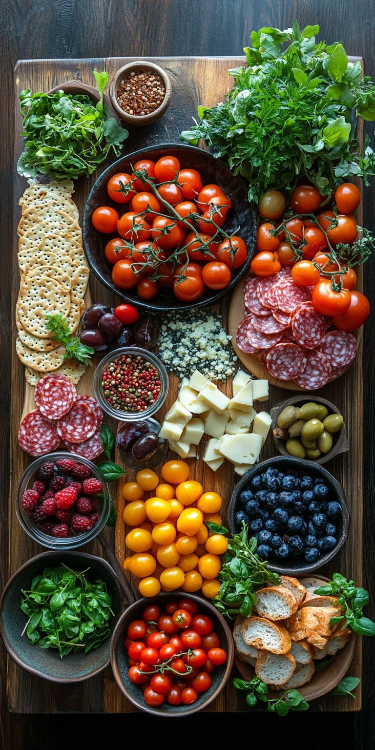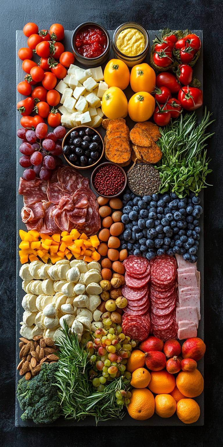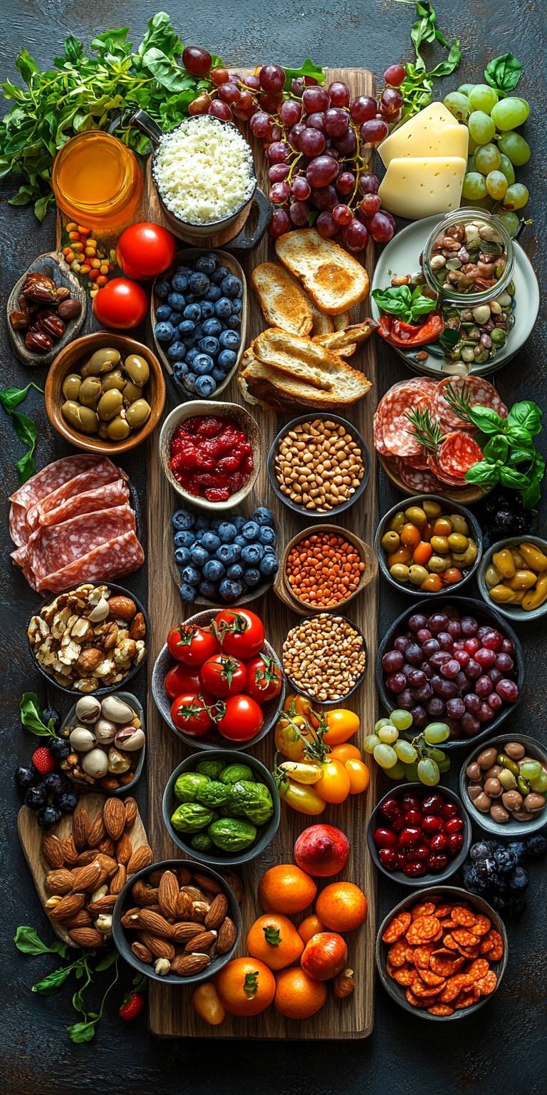 Top view of food from 5 groups beautifully displayed, promoting good health.