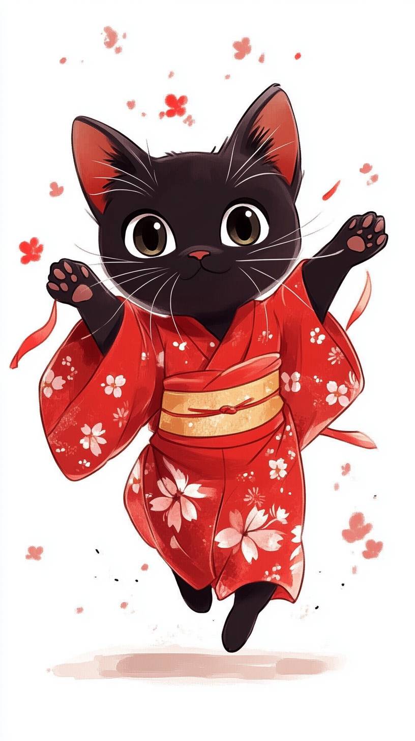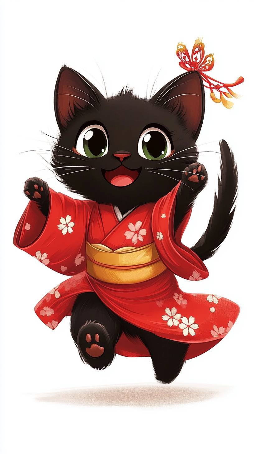 birdseye portrait cartoon of cute sweet happy black cat with pointy ears and round eyes, running while wearing red elegant flowing kimono, on white background --ar 9:16 --v 6.1