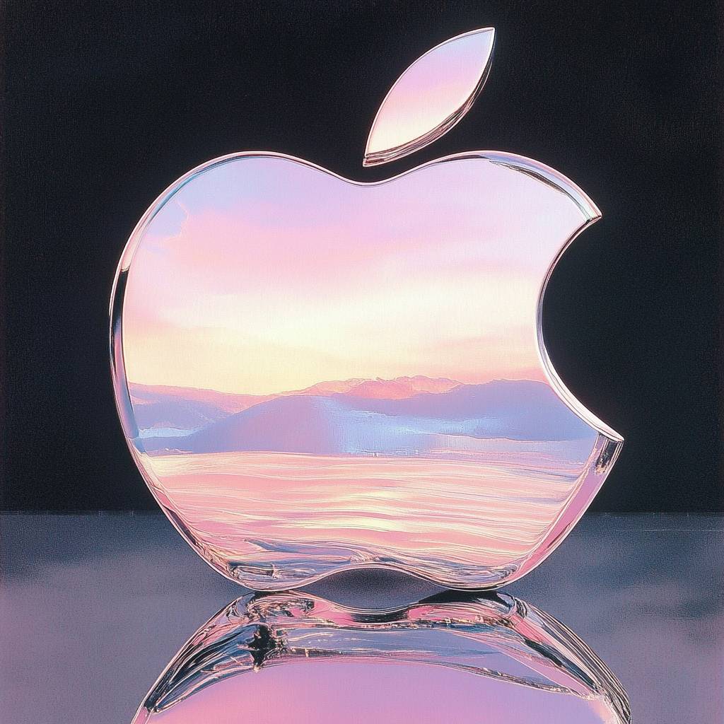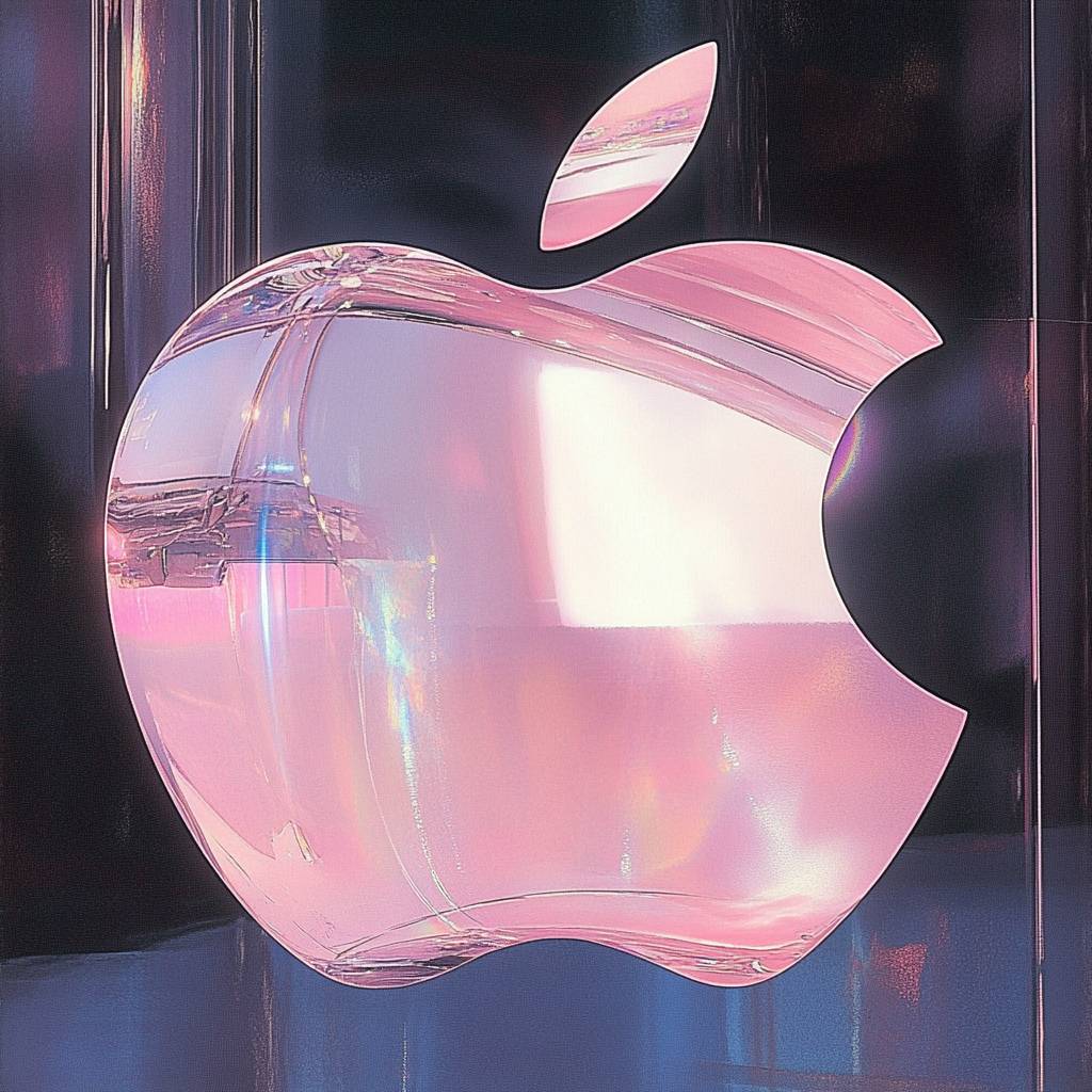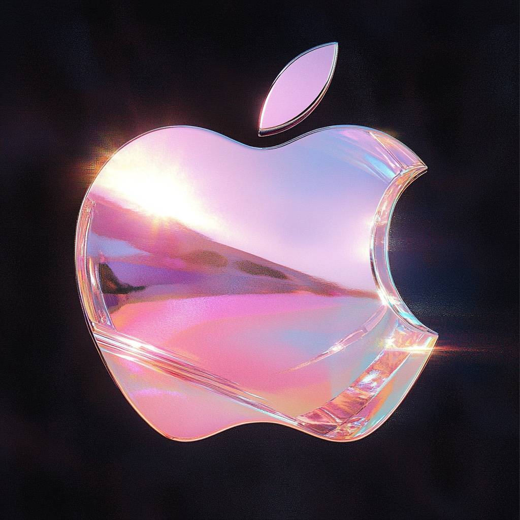 Apple logo, 3D render, chromatic aberration, 80s retro poster in the style of Sergio Toppi, muted color palette, black background, iridescent gradient.