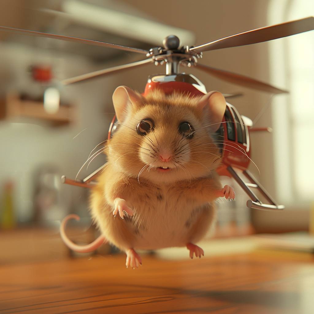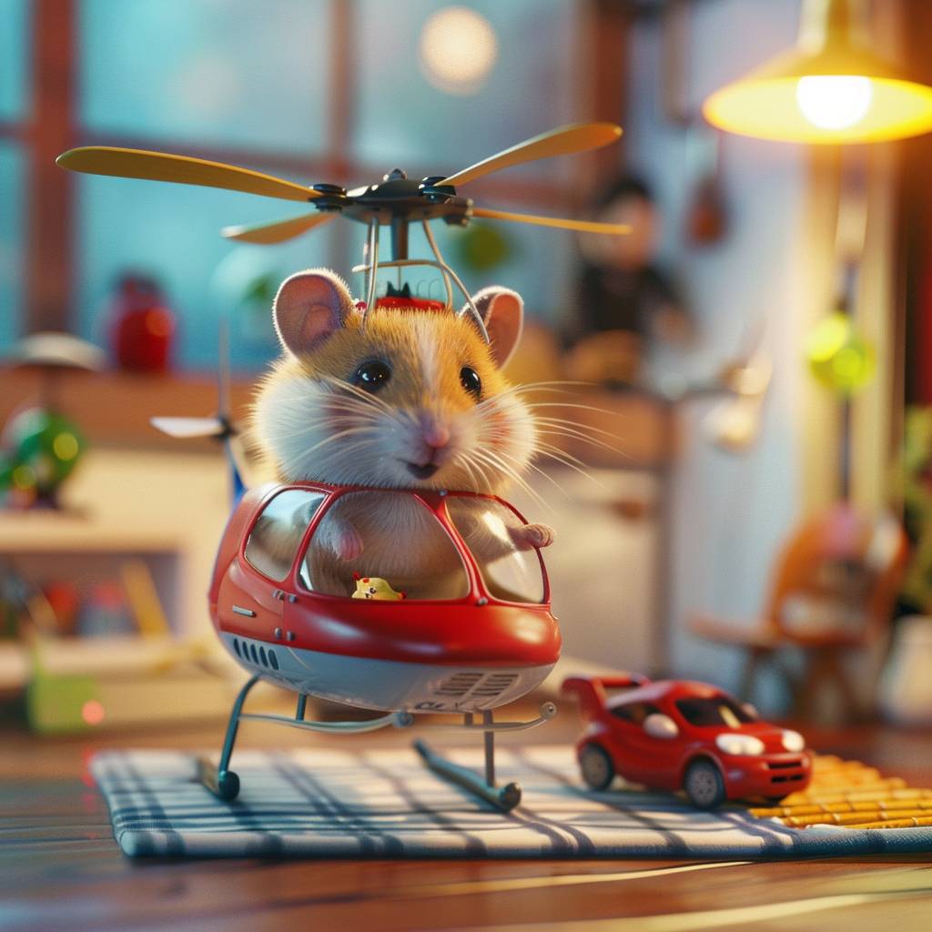 3D rendering of a hamster piloting a miniature helicopter made of household items, in the style of inventive cartoon, focused eyes, bright indoor lighting, playful atmosphere, high resolution, high detail, motion blur, colorful environment.