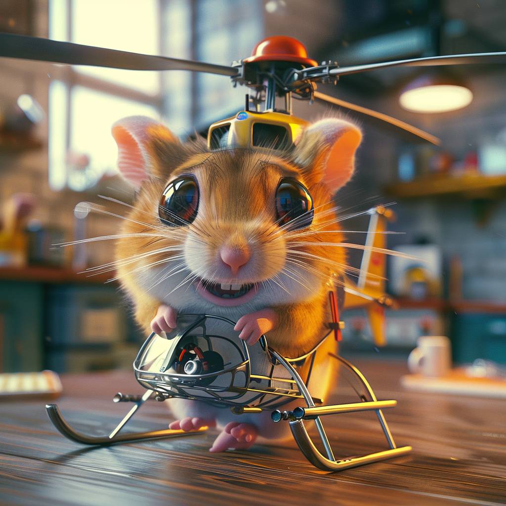 A 3D rendering of a hamster piloting a miniature helicopter made from household items, in an inventive cartoon style with focused eyes, bright indoor lighting, a playful atmosphere, high resolution, high detail, motion blur, and a colorful environment.