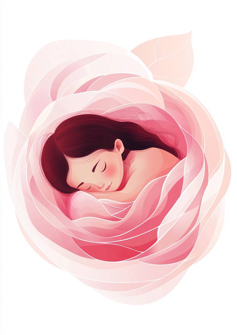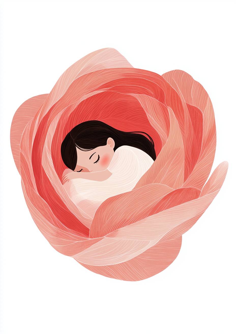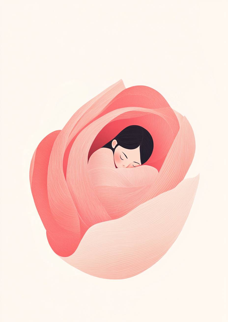 A little girl curled up inside a pink rosebud on a white background, flat illustration style, simple and elegant style, The overall image is simple and has an abstract look. --ar 105:148 --v 6.1