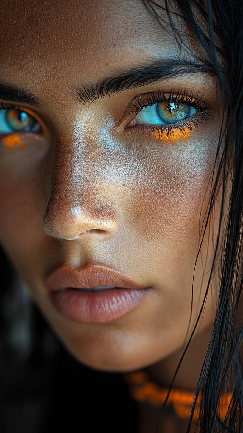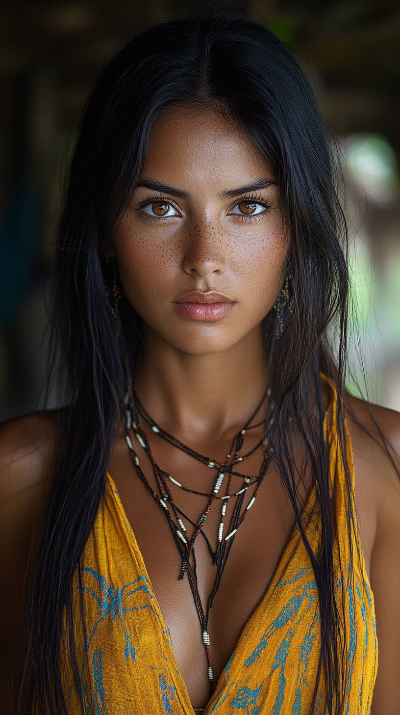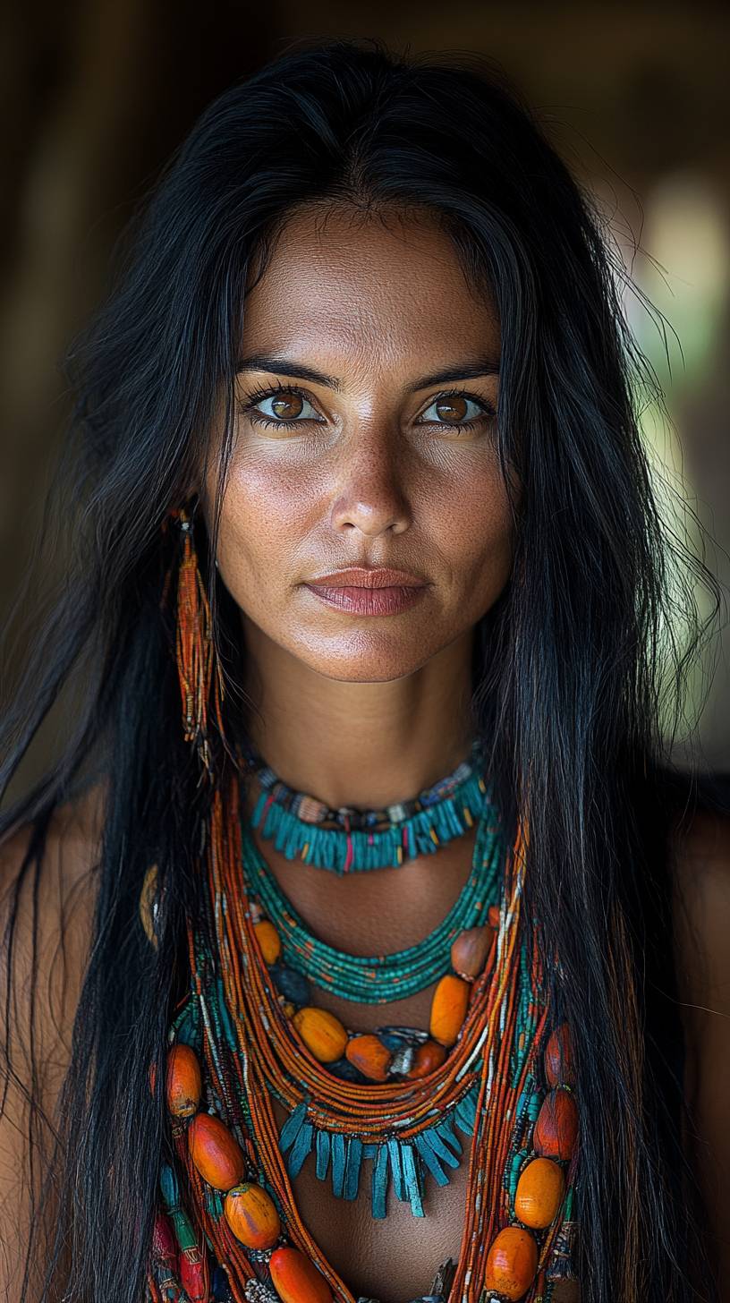 A powerful, colorful portrait of a Brazilian Indian woman in the Amazon, slanted eyes and straight black hair, captured with a Canon EOS R5 mirrorless camera, combined with the sharp and versatile RF 85mm f/1.2L USM lens. Camera settings have been meticulously chosen to emphasize the stunning details and dynamic range of the scenes, an aperture of f/2, ISO 200 and a shutter speed of 1/500 sec. The composition benefits from natural, dramatic lighting, which casts strong shadows and highlights, with a shallow depth of field, 8k --ar 9:16 --stylize 1000 --v 6.1