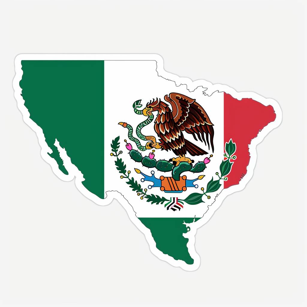 Mexican flag sticker in the shape of Mexico, white background, detailed matte finish, hyper-realistic logo.