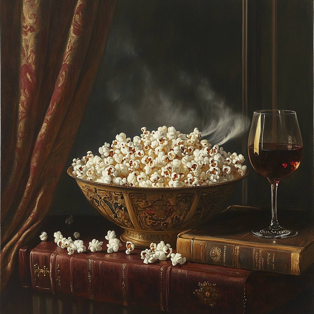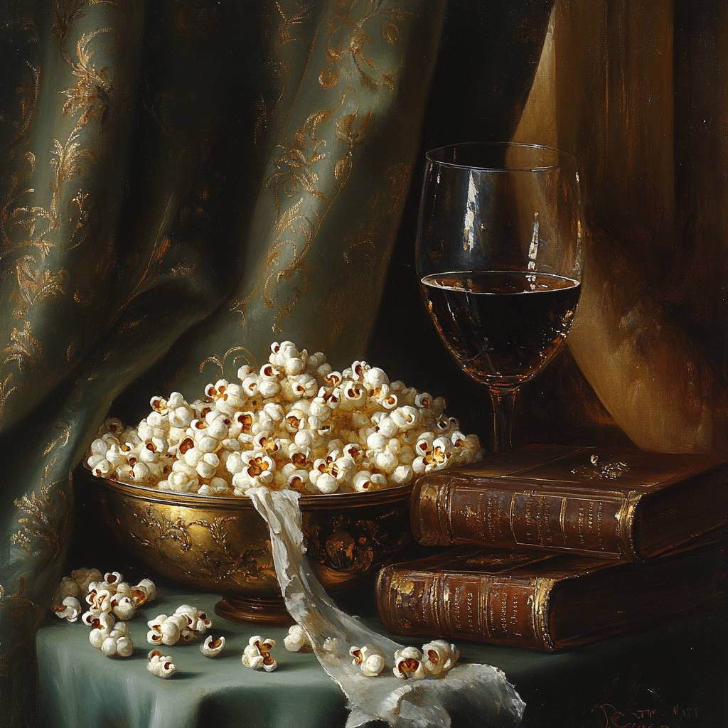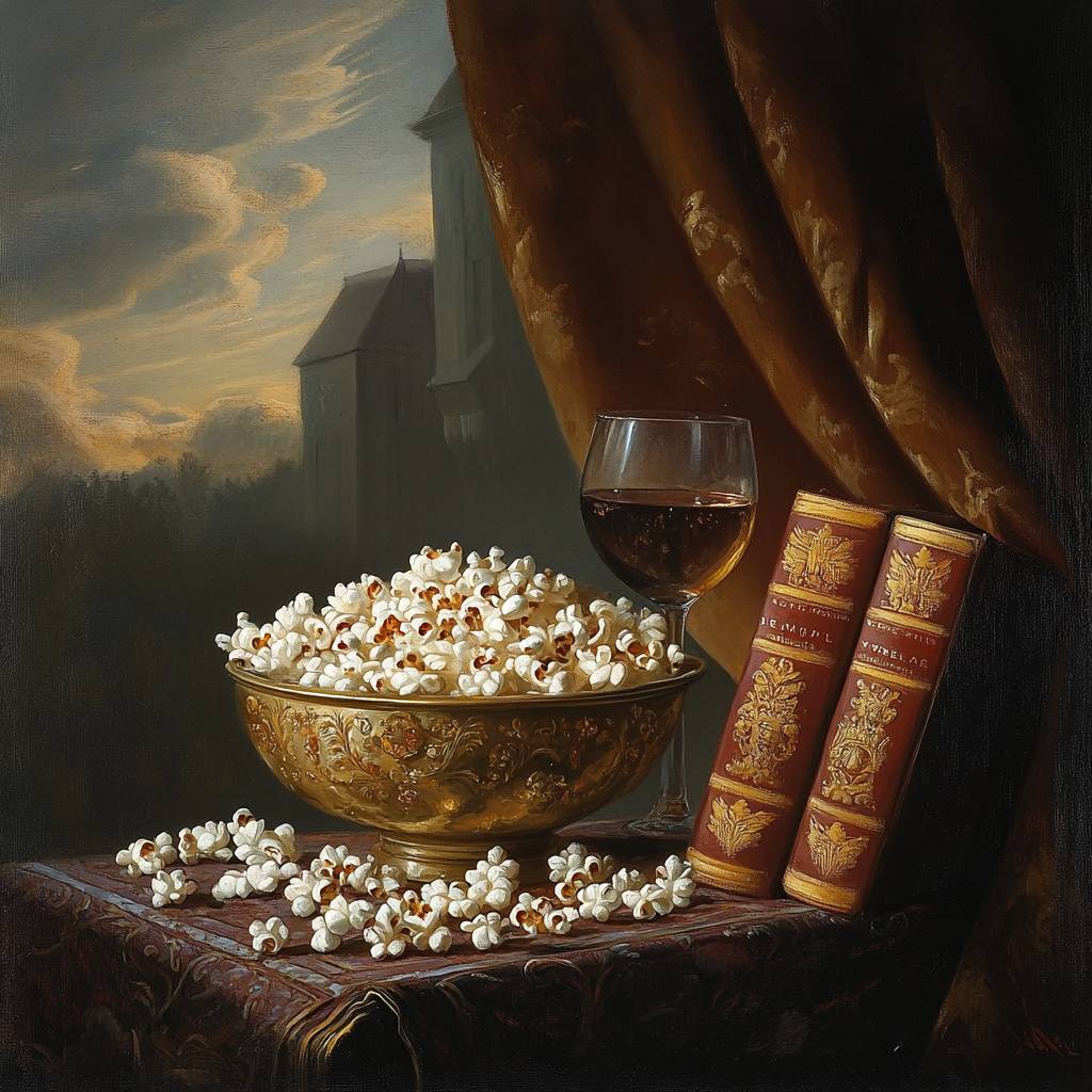A Baroque painting of a still life composition featuring a bowl of popcorn, vintage books, and a glass of wine. The bowl of popcorn is overflowing, with kernels scattered across the table. The vintage books have leather-bound covers and gold embossing. The glass of wine is placed next to the bowl. The background is dark, containing a curtain and a window. The entire scene is bathed in soft, warm light.