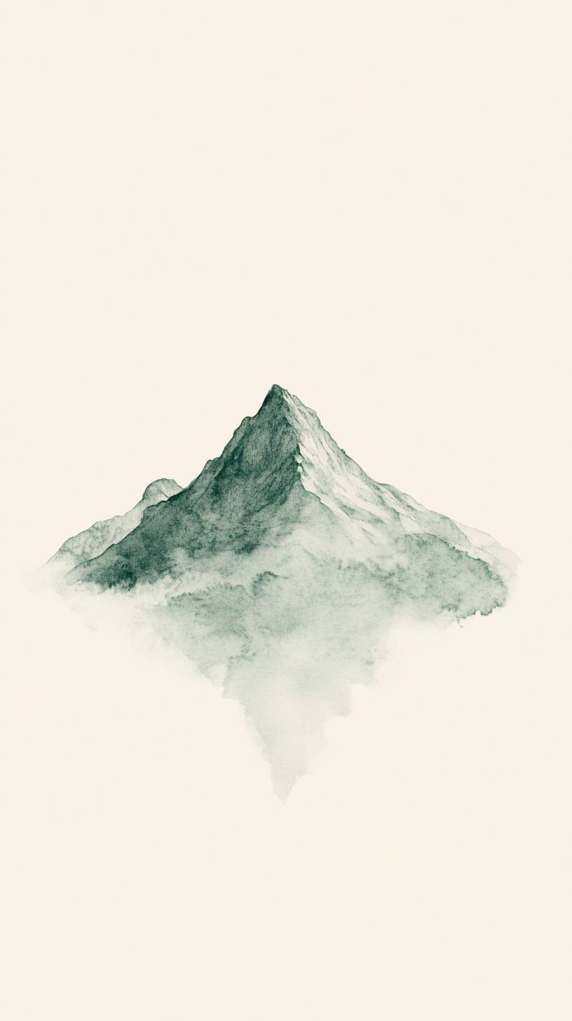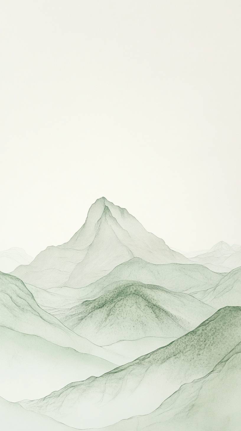 A tiny, gently rounded mountain peak, with soft, flowing lines drawn in faint green ink, centered precisely in the middle of the canvas, occupying only a small area, with the rest of the canvas entirely blank, evoking a sense of calm and harmony in a minimalist style --ar 9:16 --v 6.1