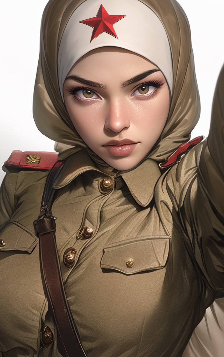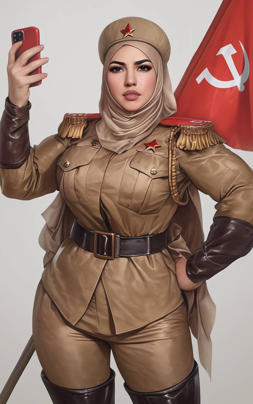 Hijab-wearing Princess Peach as a female wife, plump body, muscular, wearing Soviet uniform and rain boots, standing, selfie portrait, hyper-realistic illustration in the style of Artgerm.