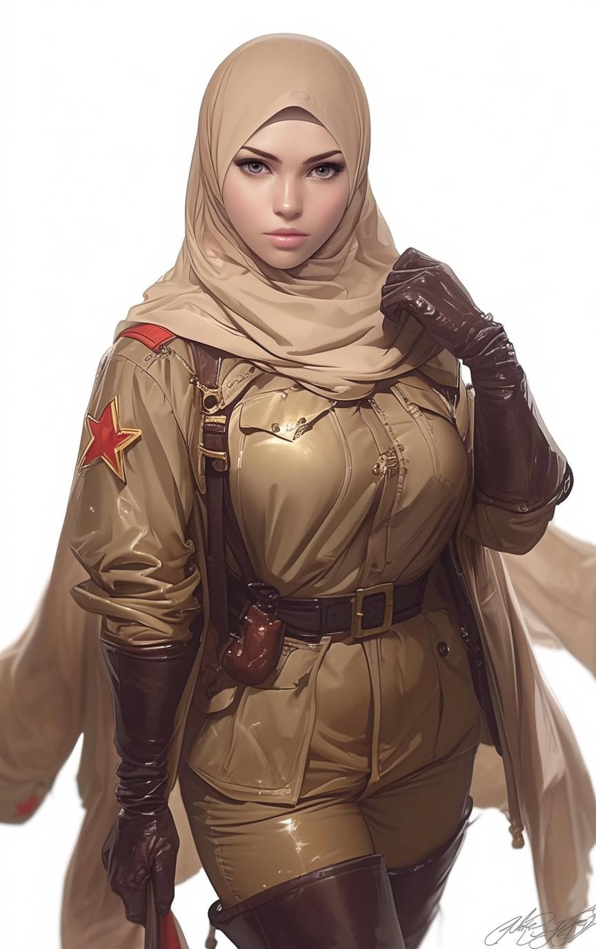 hijab princess peach as female wife, plump body, muscled wearing soviet uniform and rain boots, standing, selfie portrait, hyper-realistic illustration in the style of Artgerm, --ar 5:8 --style raw --stylize 400 --niji 6