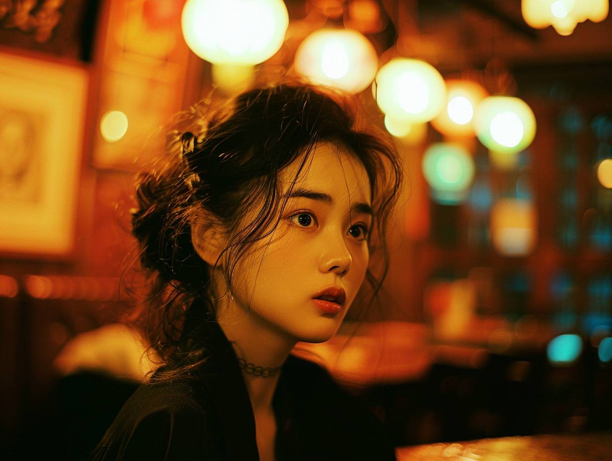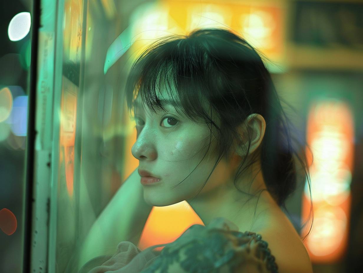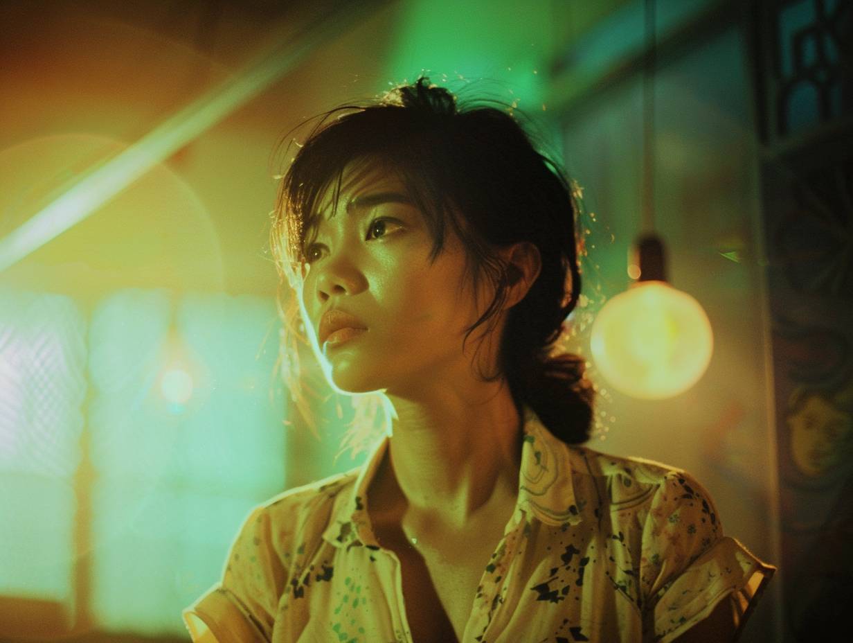 Wong Kar Wai style film, young woman confused looking aside