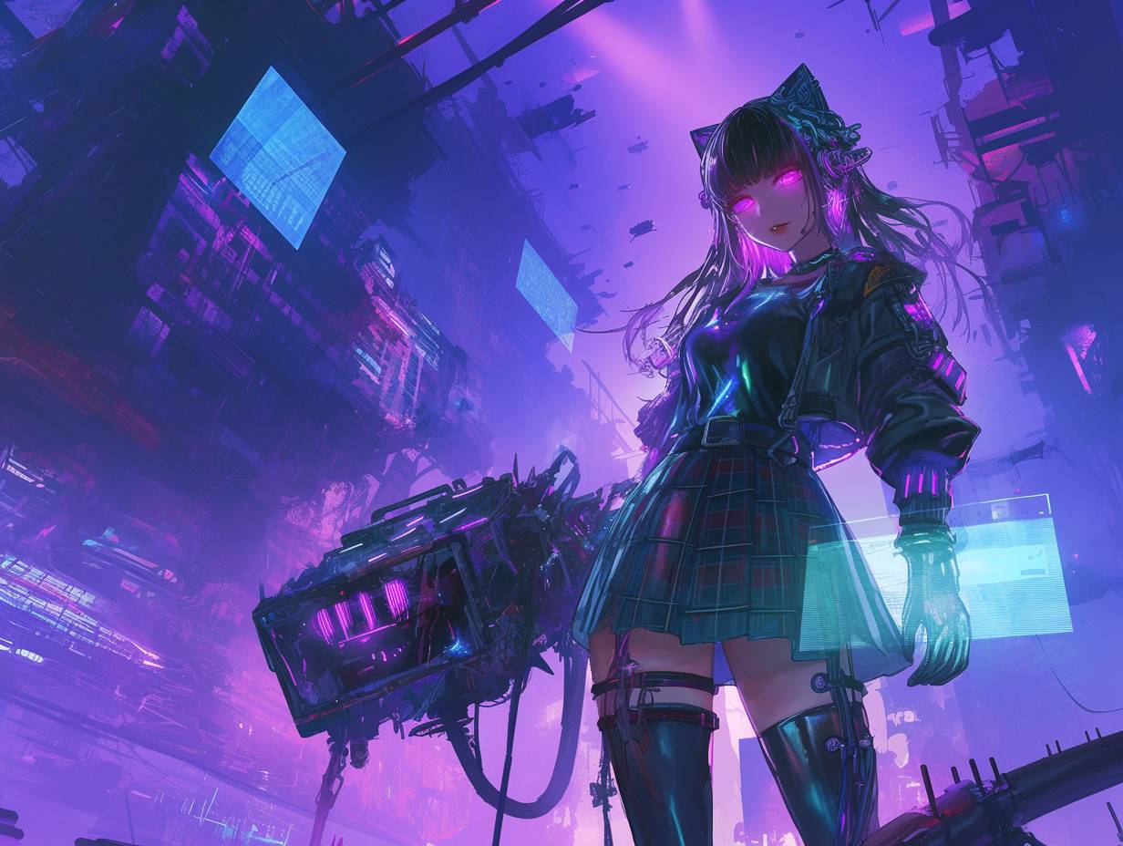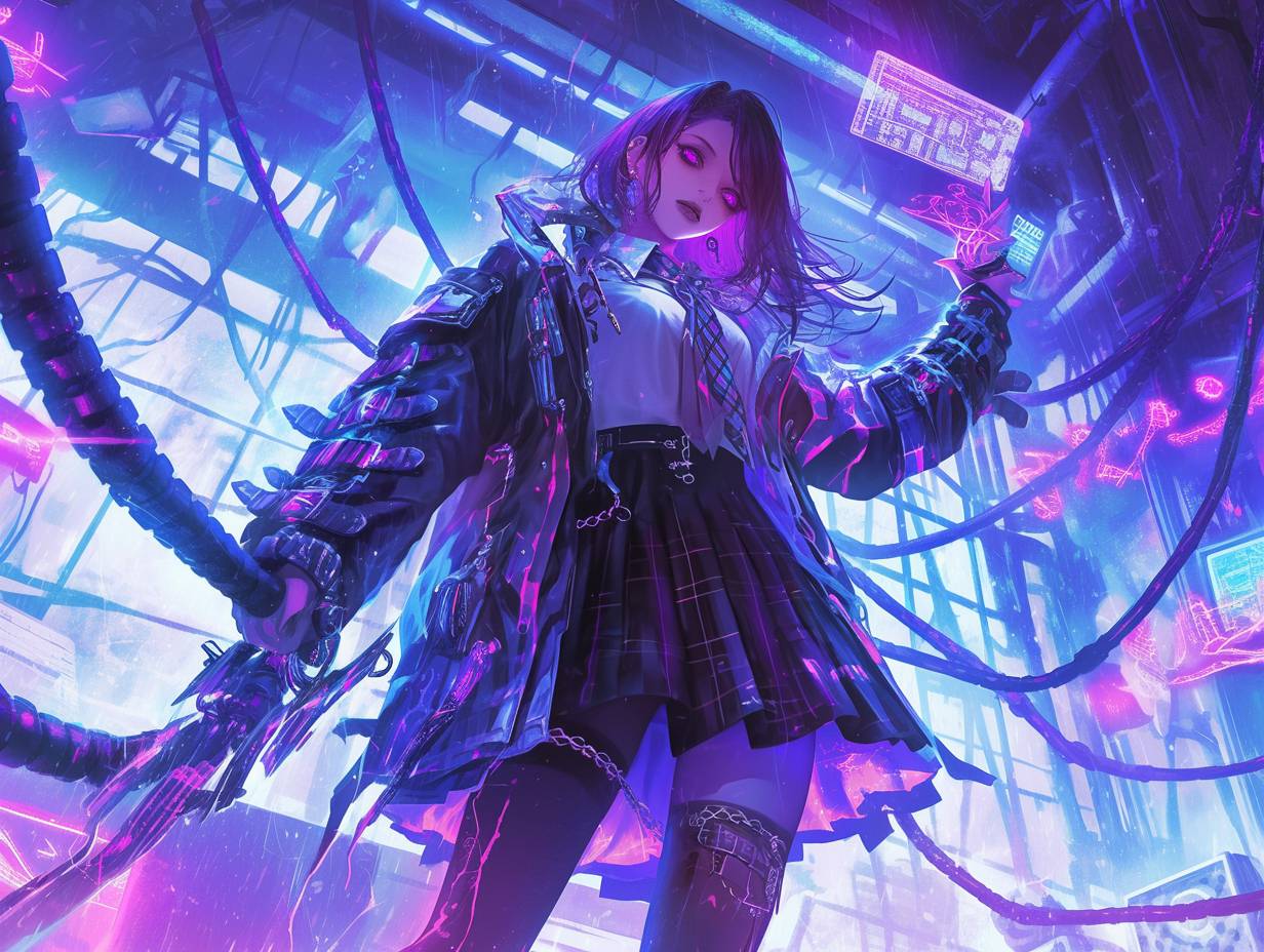 Medium shot of an 18-year-old Japanese girl with skin embedded glowing circuits, spiky hair with color-shifting nano-pigments set to purple, LED eyeliner and metallic lipstick voice modulator, wearing a graphene jacket with holographic chains and retractable spikes, display fabric skirt with glitching plaid, and data-scrolling mesh stockings, standing against an abandoned nanotech factory wall with interactive graffiti and AR tags, her gaze intense, enhanced by retinal HUD, holding a neural-linked holo-projector, background of broken holograms, exposed fiber optics, and old 3D-printers, rogue nanobots in the air, scene exudes digital rebellion and techno-defiance, embodying hyper-industrial cybergoth aesthetic.