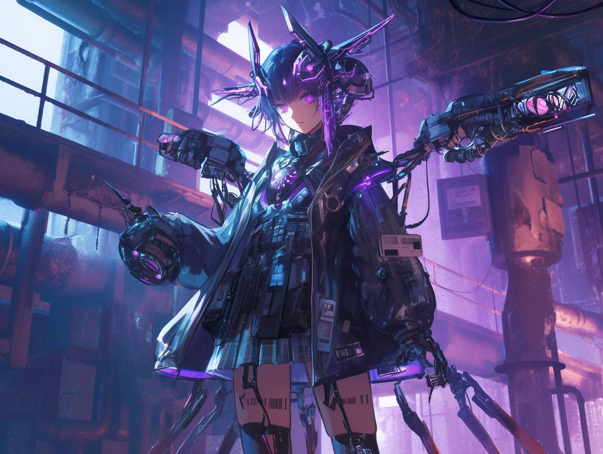 medium shot of an 18-year-old Japanese girl with skin embedded glowing circuits, spiky hair with color-shifting nano-pigments set to purple, LED eyeliner and metallic lipstick voice modulator, wearing a graphene jacket with holographic chains and retractable spikes, display fabric skirt with glitching plaid, and data-scrolling mesh stockings, standing against an abandoned nanotech factory wall with interactive graffiti and AR tags, her gaze intense, enhanced by retinal HUD, holding a neural-linked holo-projector, background of broken holograms, exposed fiber optics, and old 3D-printers, rogue nanobots in the air, scene exudes digital rebellion and techno-defiance, embodying hyper-industrial cybergoth aesthetic --ar 4:3 --niji 6