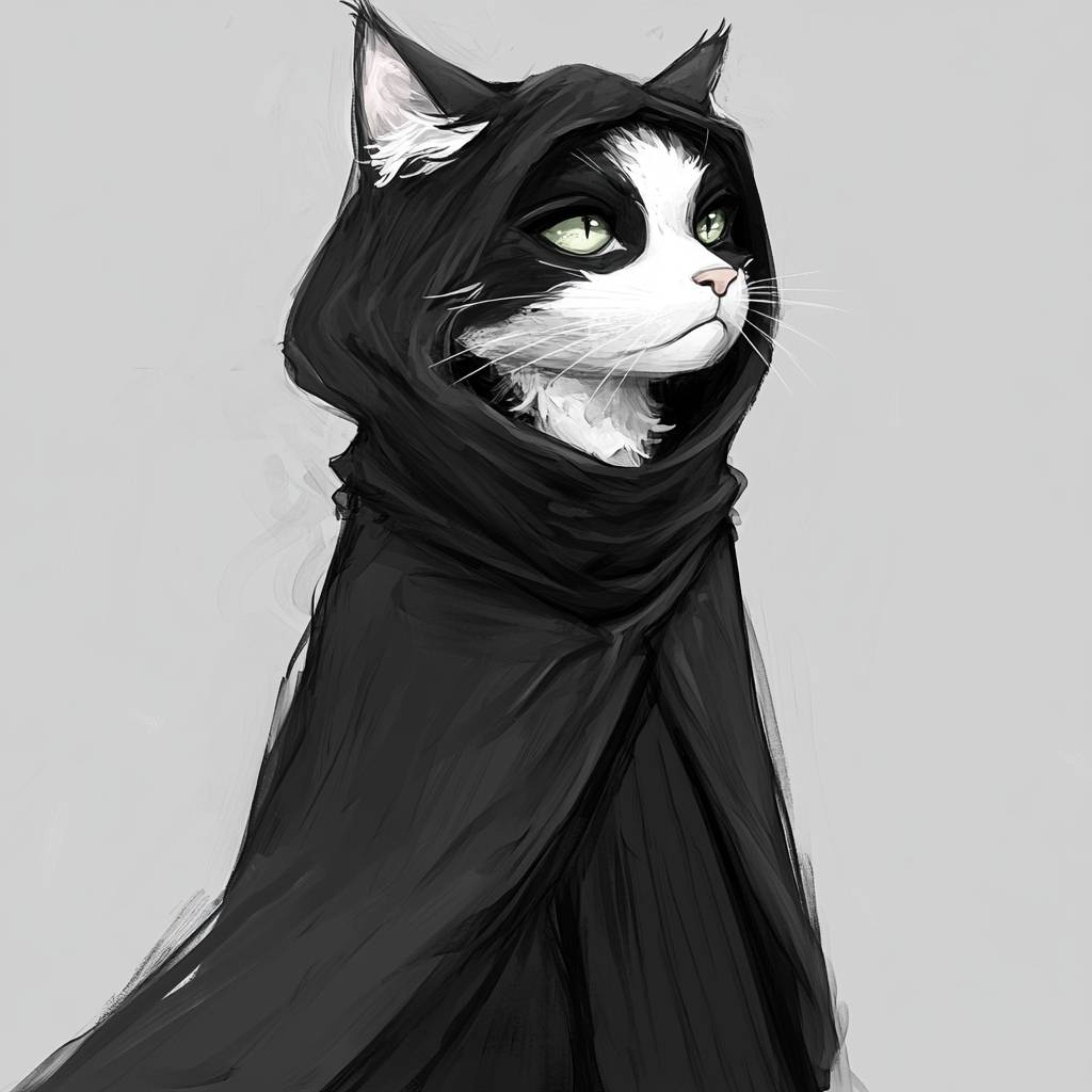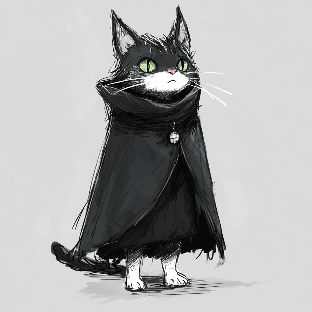 A humanoid with black and white fur and cat features. It has white fur around its nose, mouth, and paws, a small pink nose, and green eyes. Pointy ears and a simple dark cloak around its shoulders. The character stands upright, looking thoughtful. Hand-drawn sketch style, black and white only, high contrast, detailed line work, resembling a pencil drawing.