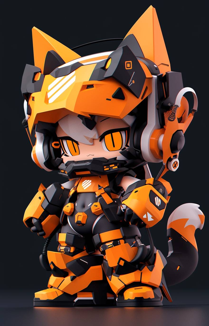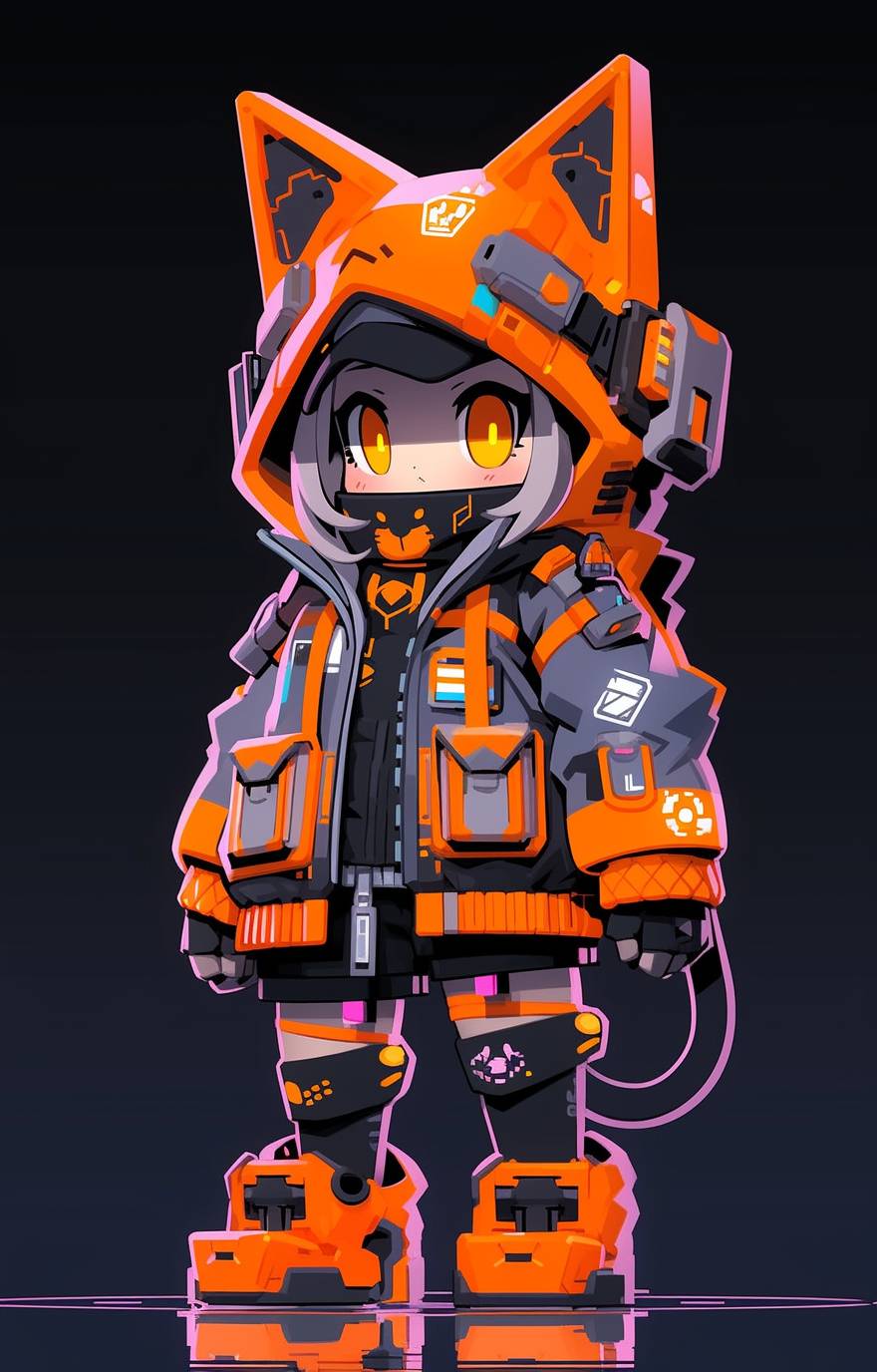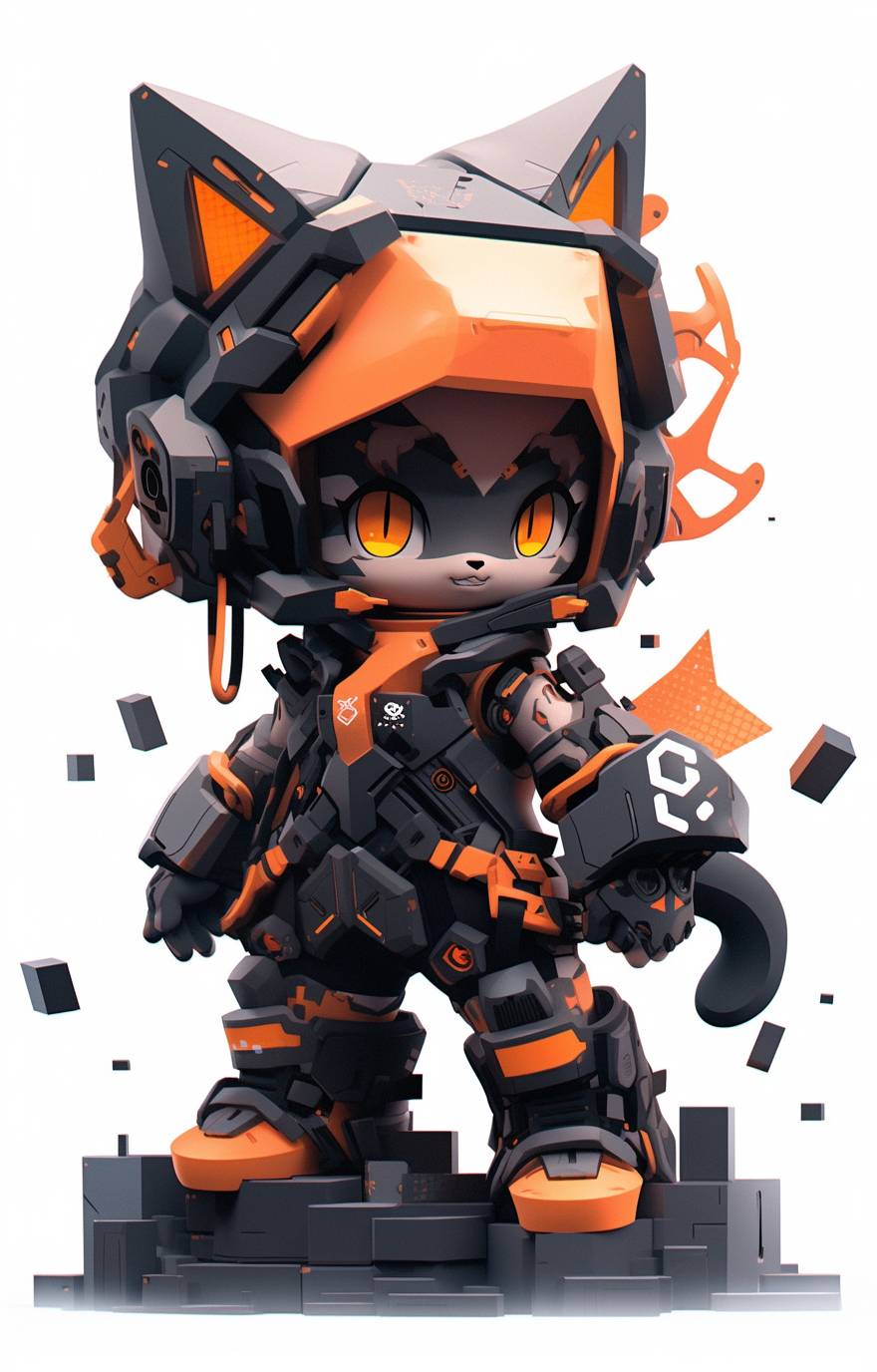 3D cartoon style, blind box toy character design, chibi cyberpunk cat girl in mecha suit, orange and black color scheme, pixel art.