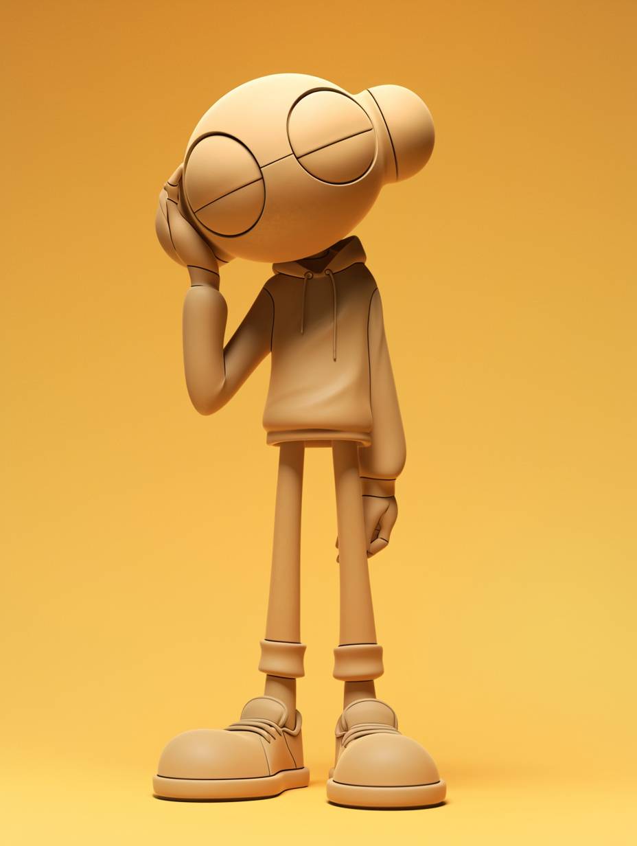 A cartoon character, a sculpture of art, looking at the viewer, bored pose, full body, fine luster, clay materials, the future feels, clean background, natural lighting, 3D toy, IP by Pop Mart, mockup blind box, edge light, front view, octane render, Blender, fashion trend, art, hyper quality, Ultra HD, 8K