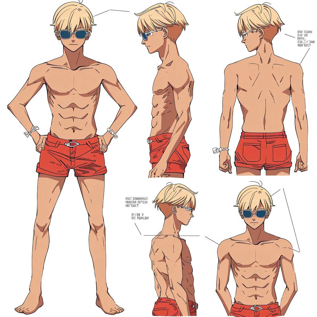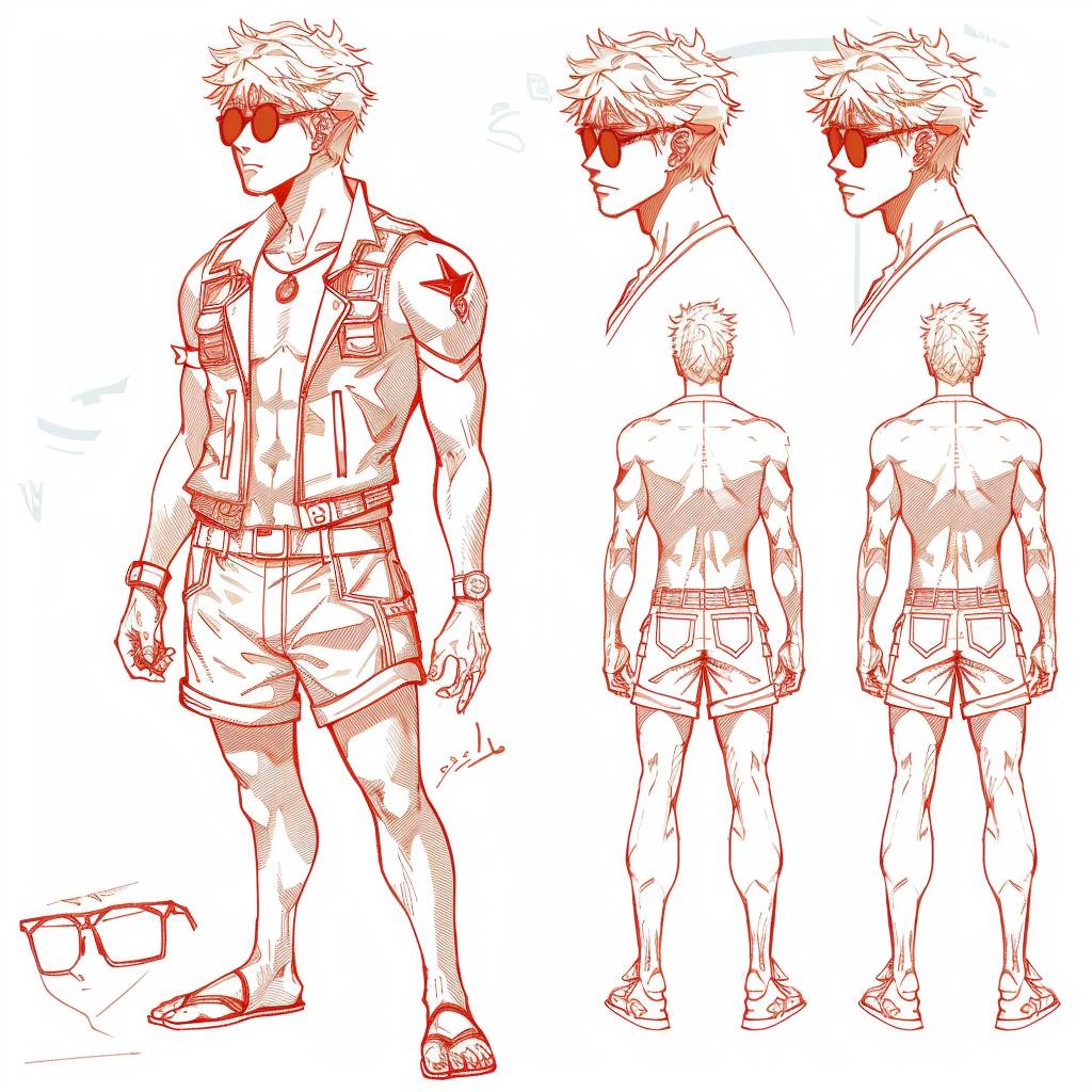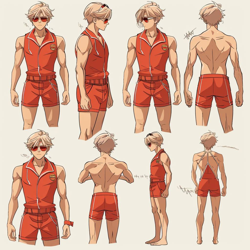 A character design sheet of an anime [male lifeguard with short, sun-bleached hair, wearing sunglasses and a red lifeguard outfit], in different poses, front view, side view, and back view, [red] pencil sketch on a white background, concept drawing, simple lines, flat colors, hand-drawn style with simple lines on a white background, character concept art, mesh base --v 6.0