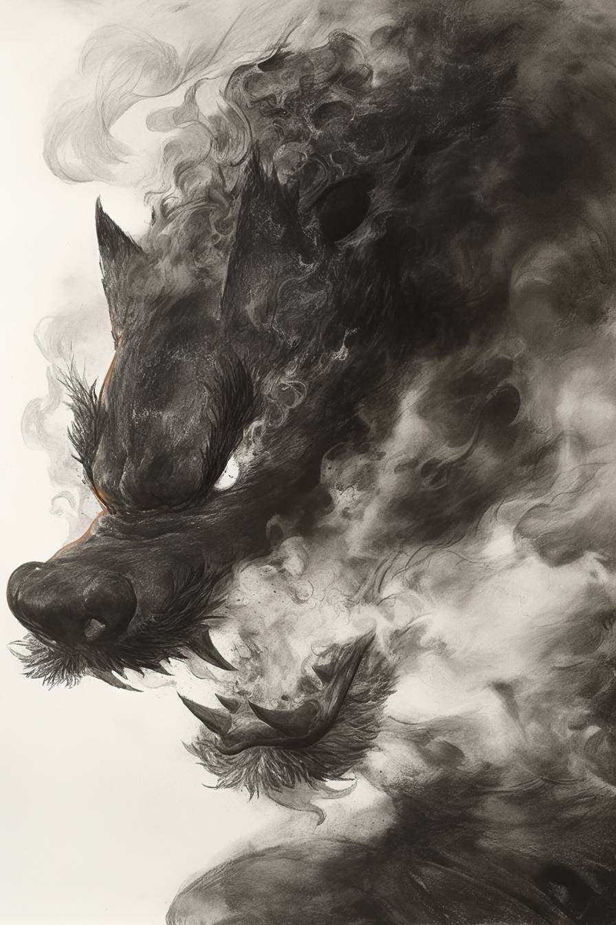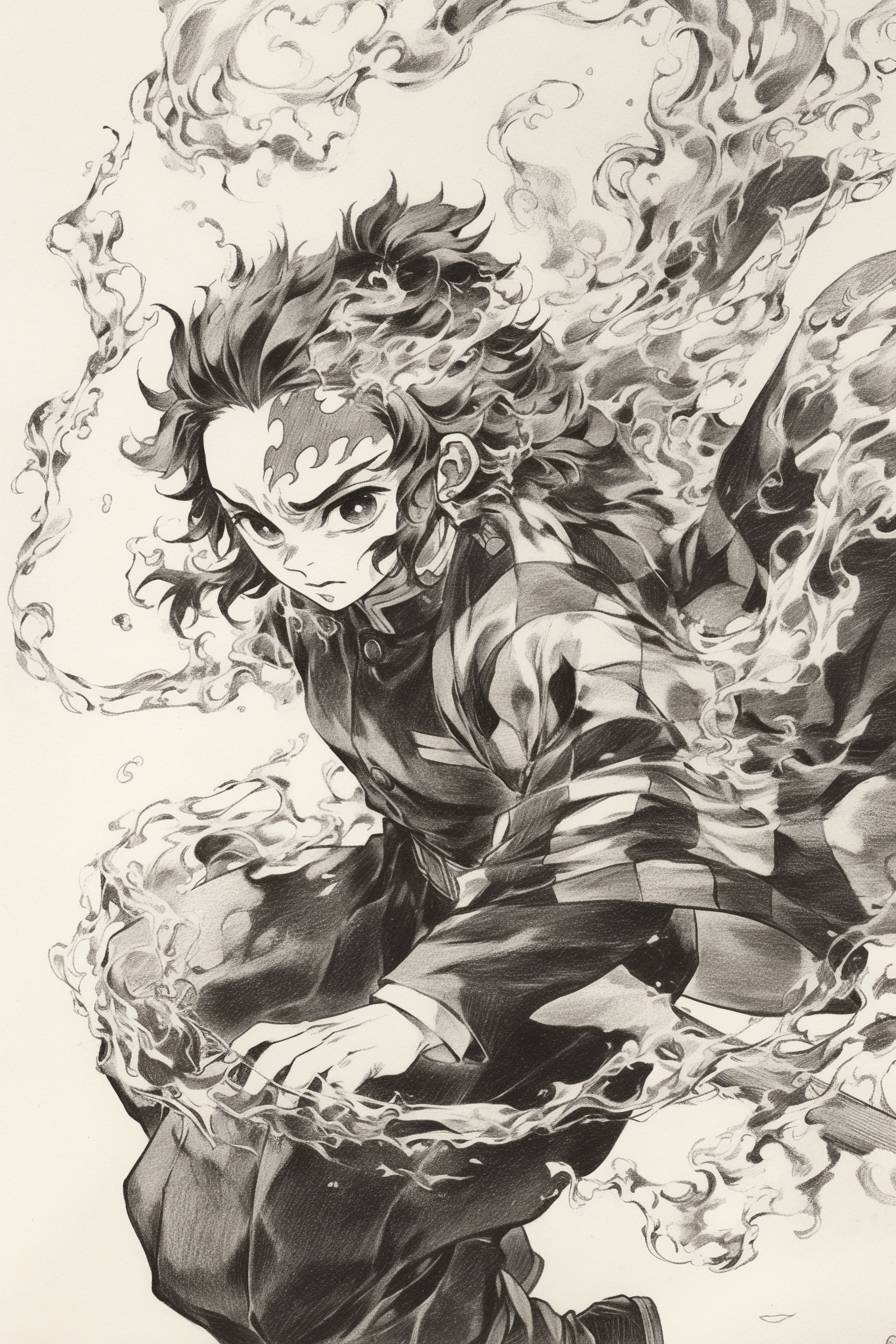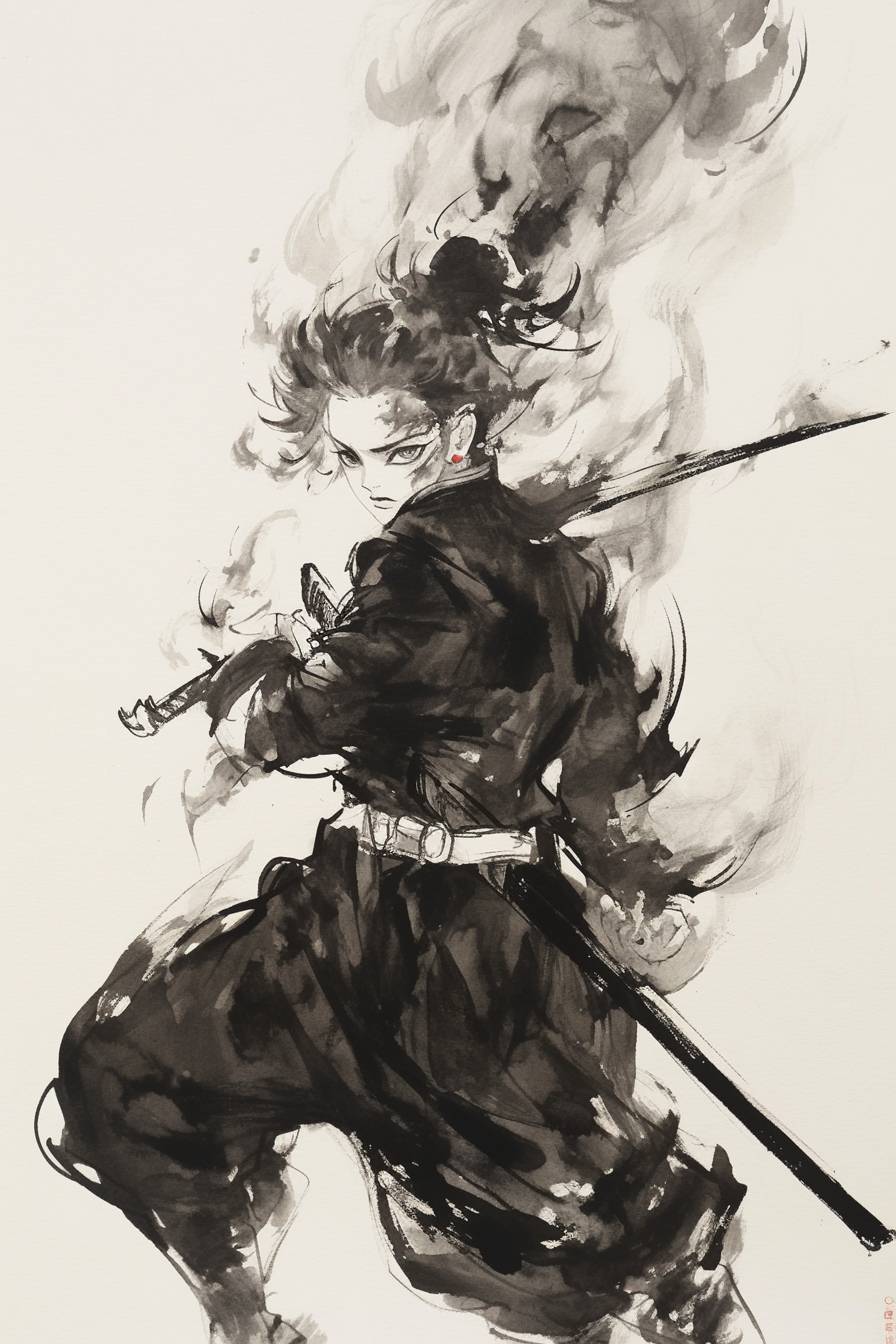 Fire Hashira from Demon Slayer. Cai Guo-Qiang's charcoal drawing --niji 6 --ar 2:3