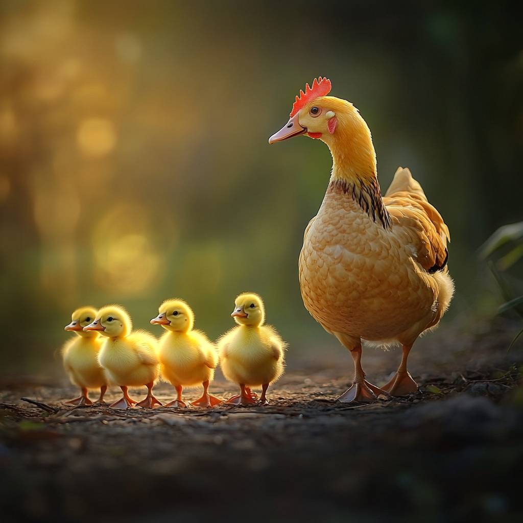 A group of ducklings learning to walk behind an old mother chicken, looking very cute.