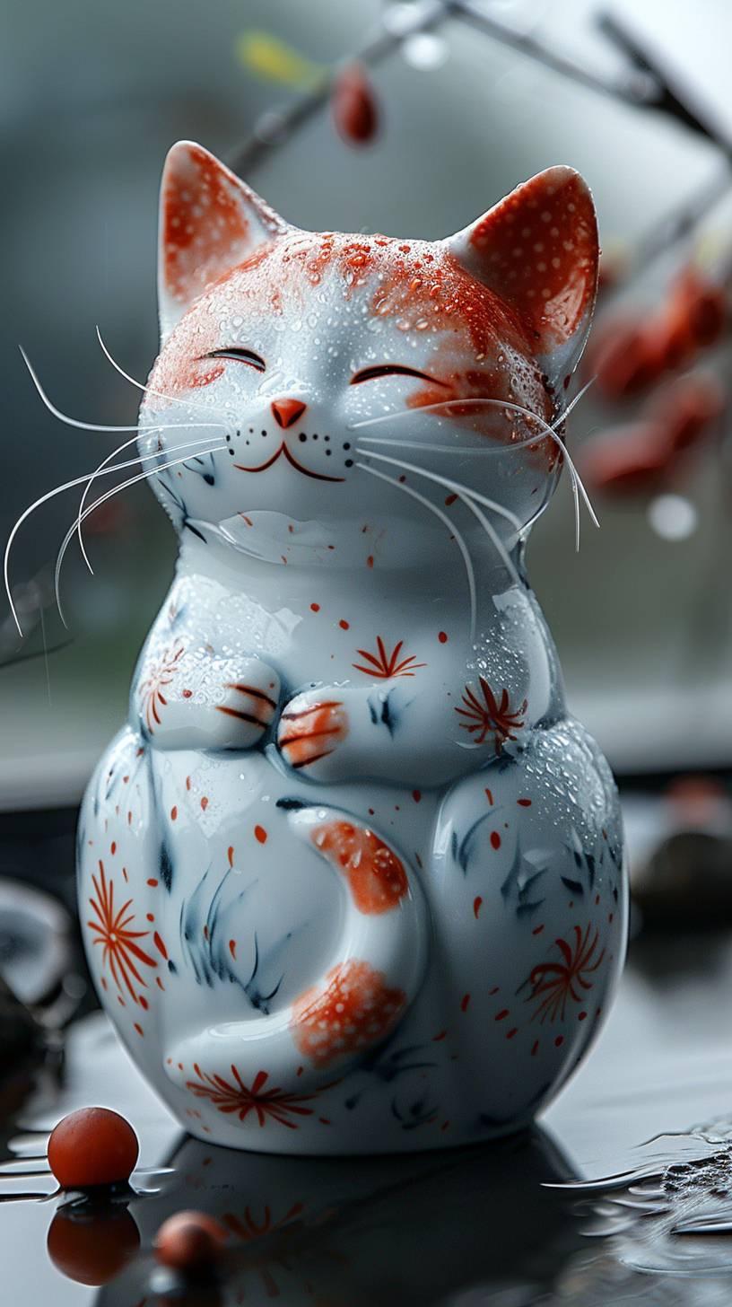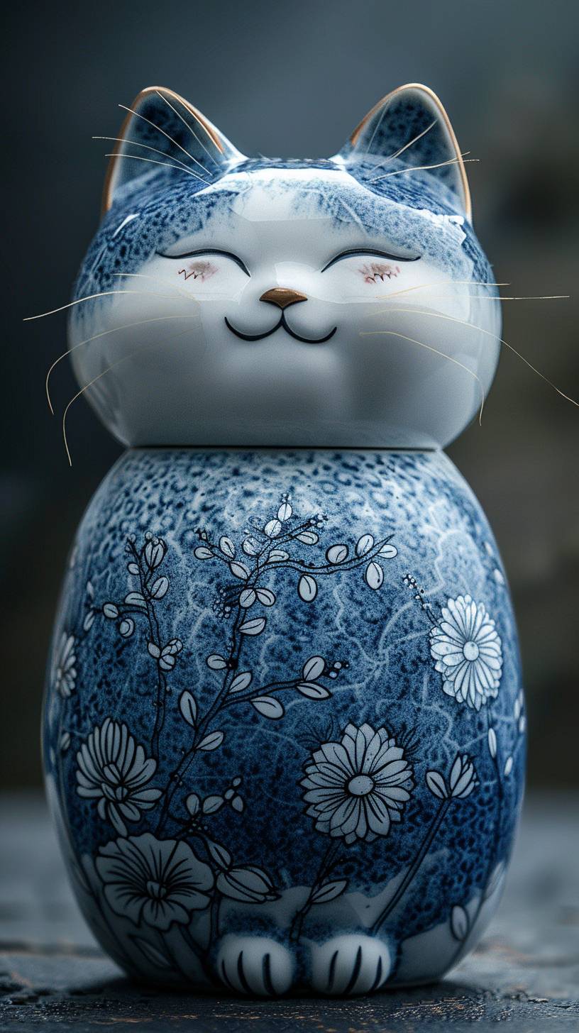 A cute cat made of Chinese porcelain, reflecting contemporary art and Chinese ink wash style.