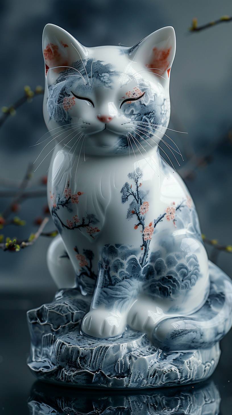 A cute cat made of Chinese porcelain, ceramic material, real reflection, contemporary art, Chinese style, Chinese ink wash style,product photography, dark gray gradient background, studio lighting, --ar 9:16 --stylize 750 --v 6.0