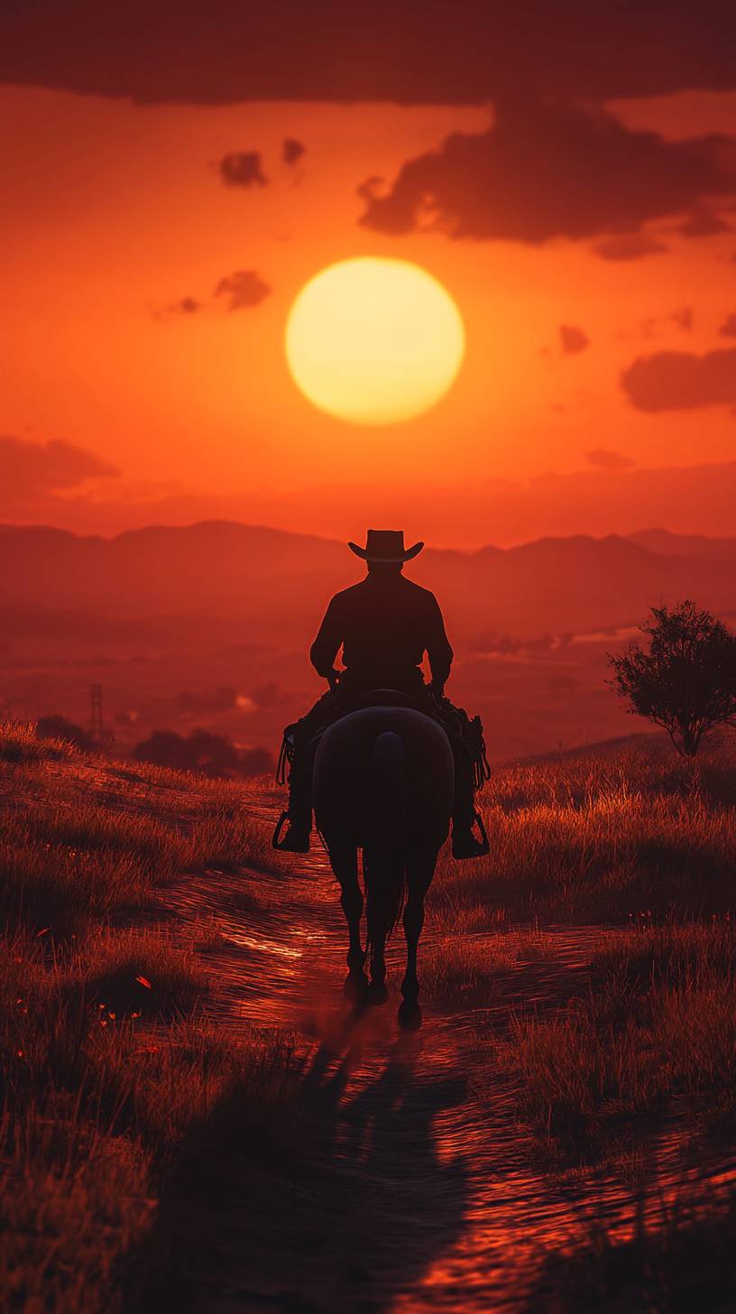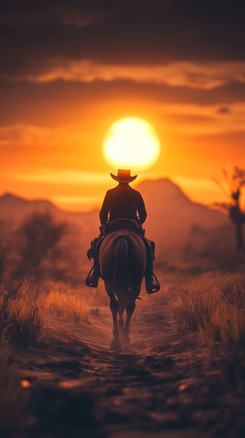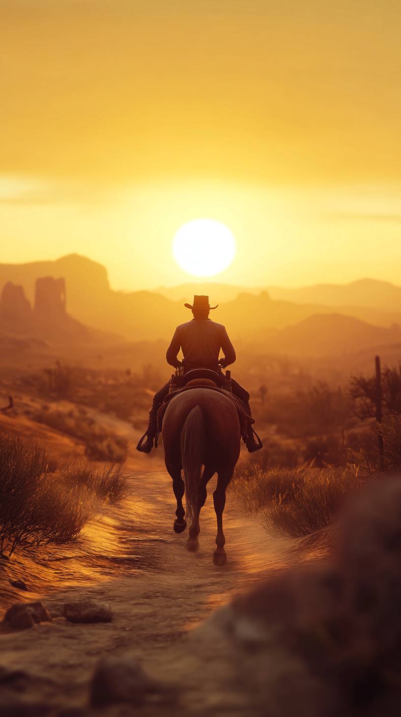 cowboy riding horse into sunset, desert setting, unreal engine --ar 9:16 --v 6.1
