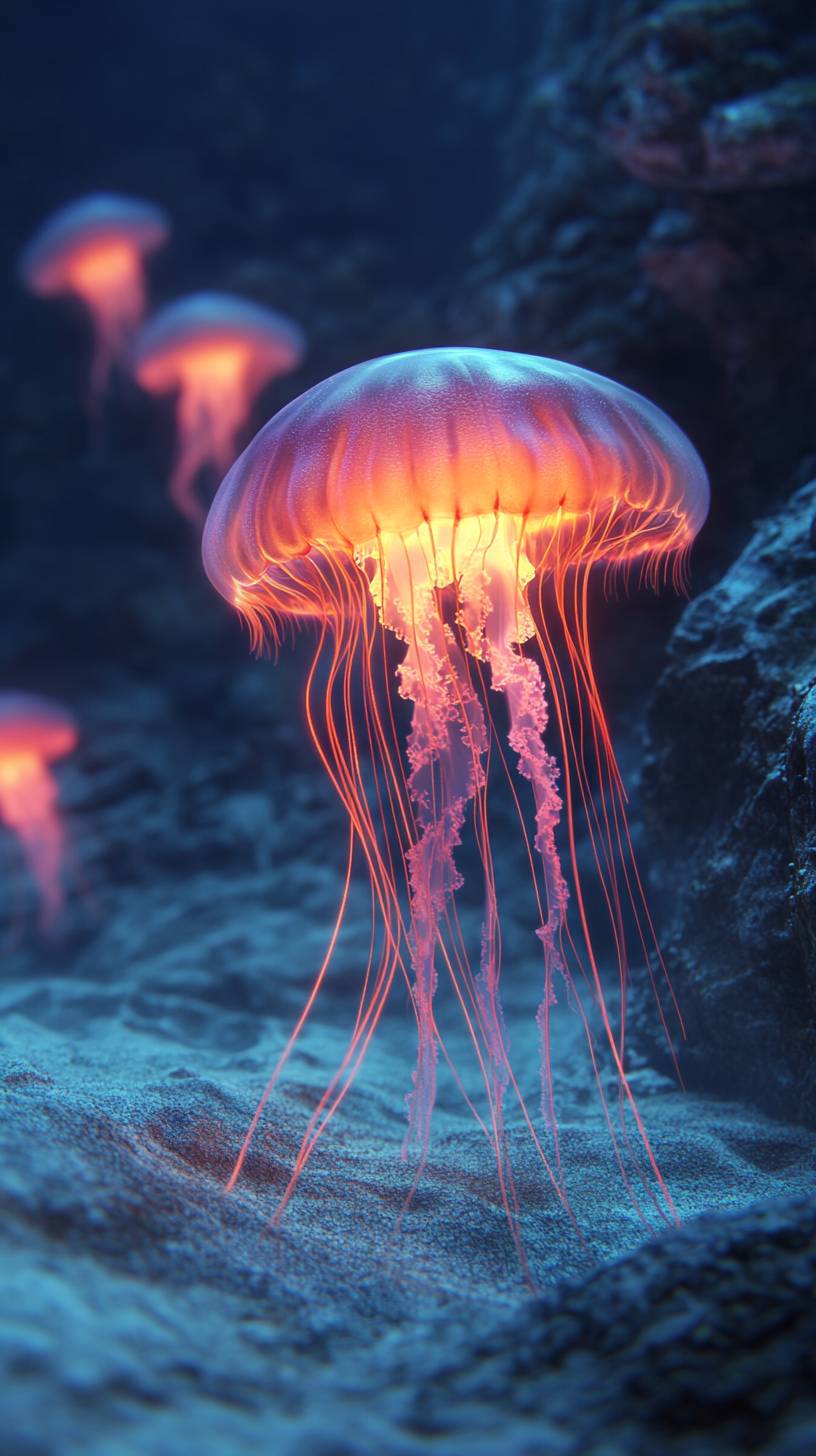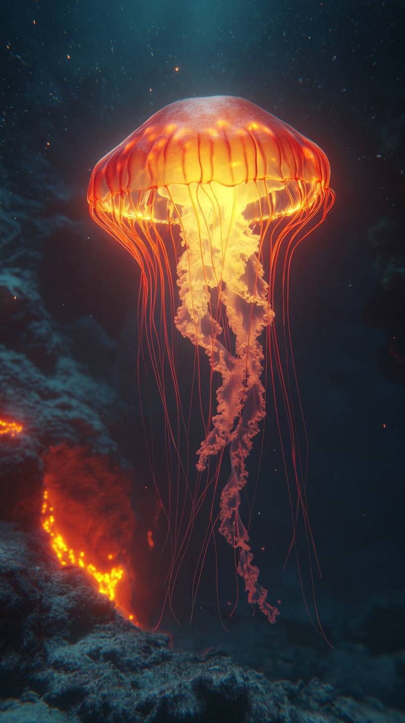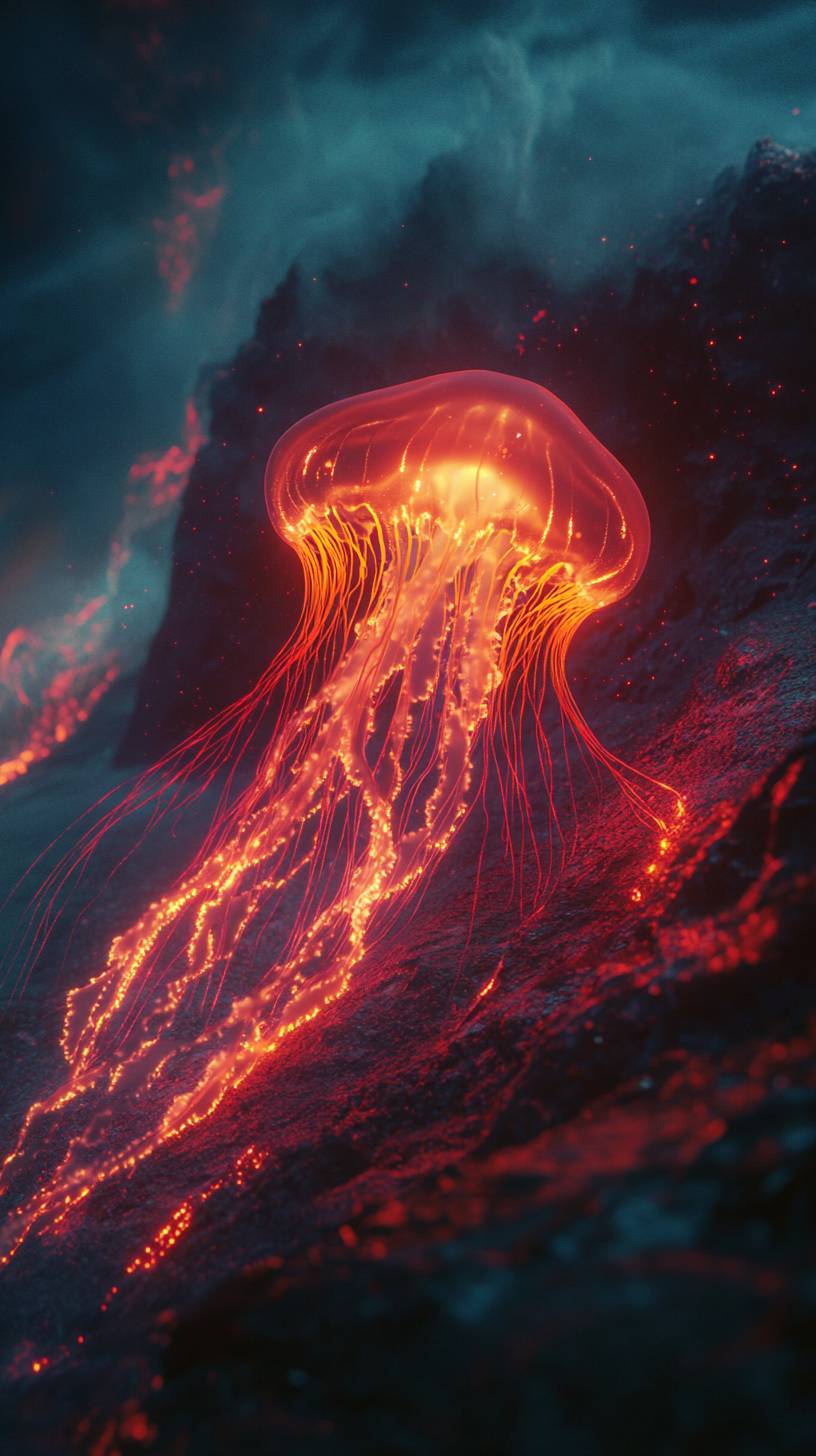 film still, glowing jellyfish resting near the base of an underwater volcano, bioluminescent red and yellow light, high detail, translucent body softly glowing, dark and eerie underwater environment, faint glow from volcanic vents in the distance, soft light illuminating the seabed, jellyfish tendrils gently trailing along the sand, peaceful yet mysterious, no other creatures present, jellyfish calmly floating near the volcanic structure, deep-sea exploration theme, subtle water reflections on the seabed, surreal and captivating atmosphere, 8K resolution, cinematic shot with focus on the volcanic structure --ar 9:16 --v 6.1