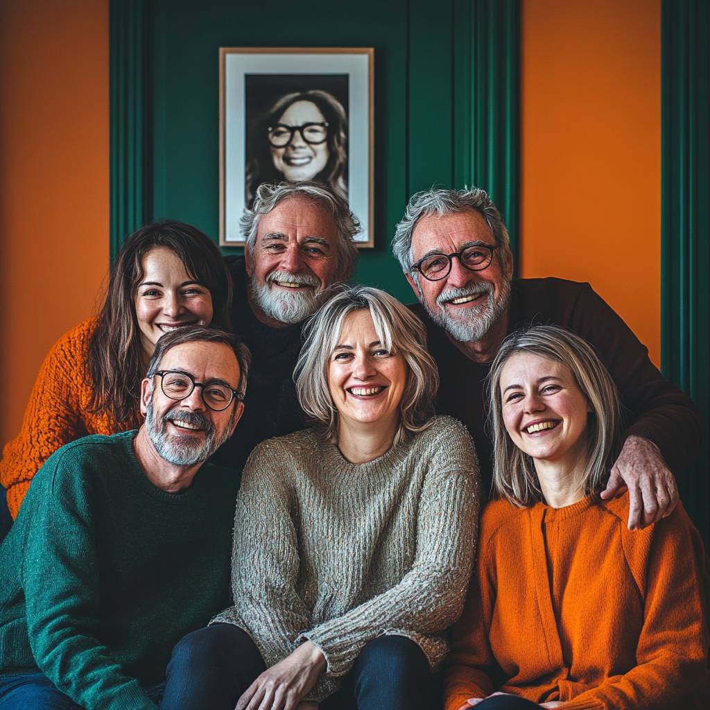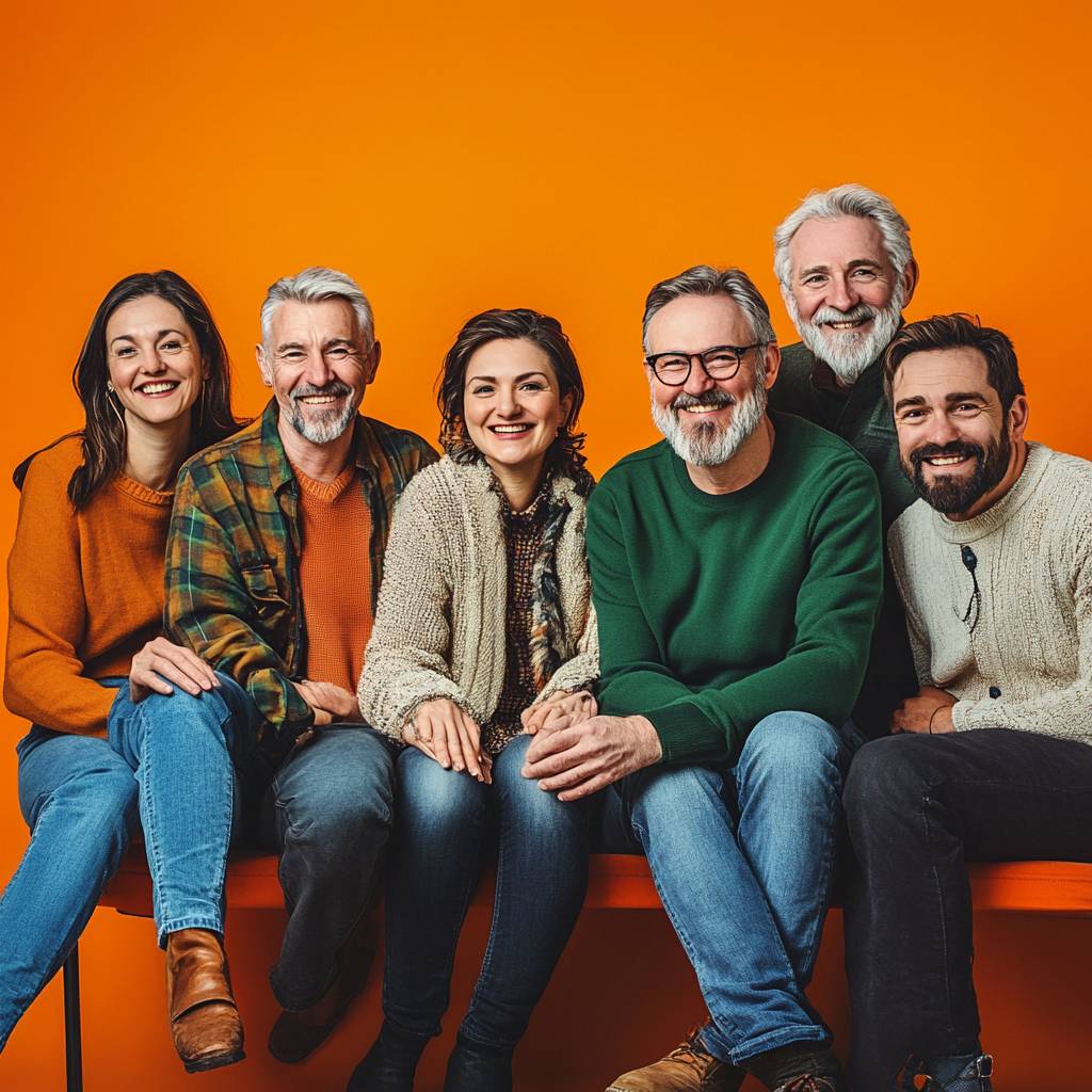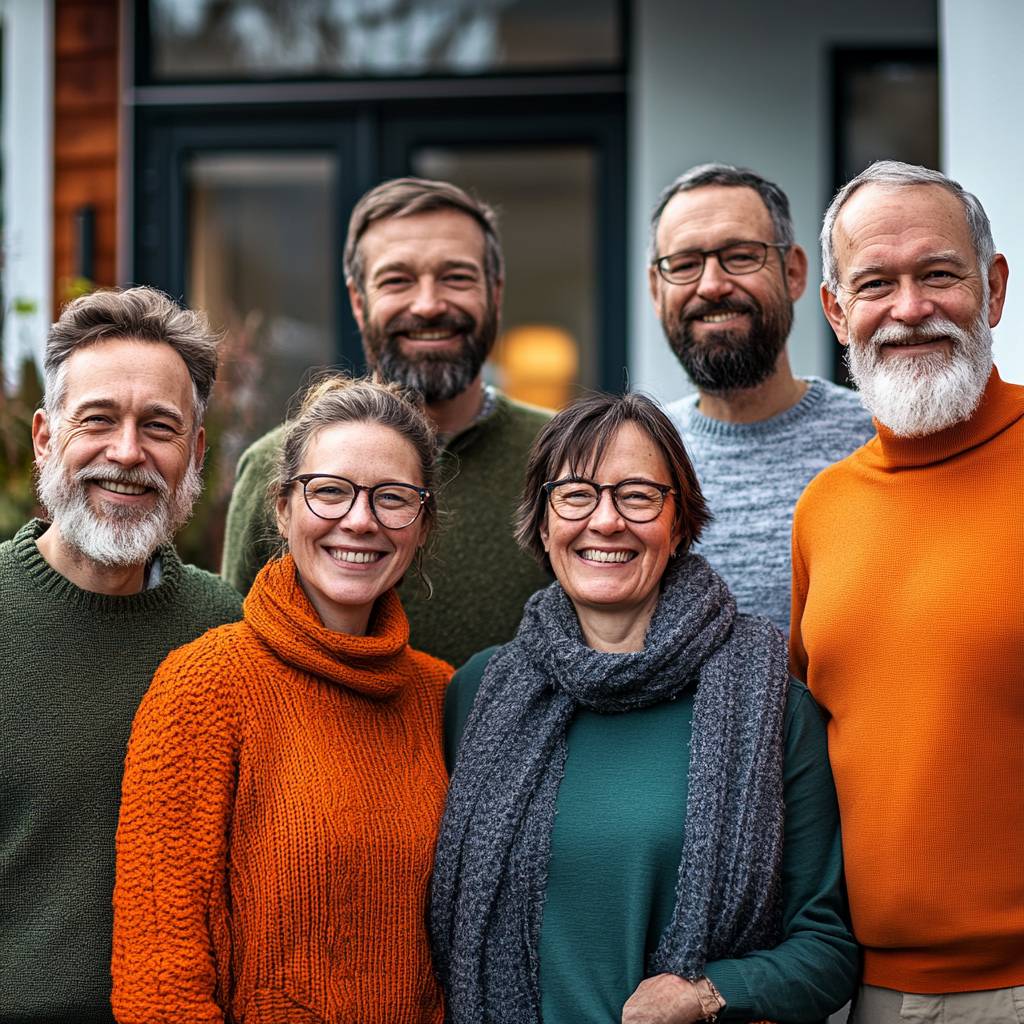 A group of happy real homeowners in different ages. The overall tone of the image is cool, with dominant orange, green and blue hues. The mood is current and product phototgraphy --style raw --v 6.1