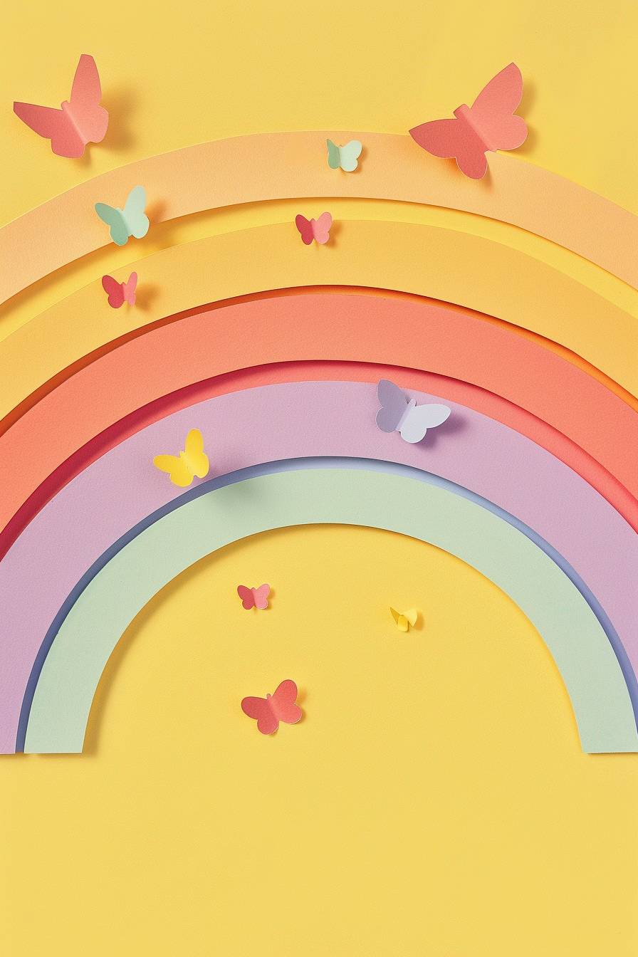 A pastel colored rainbow with a simple light yellow background, featuring tiny birds flying in a flat design style.
